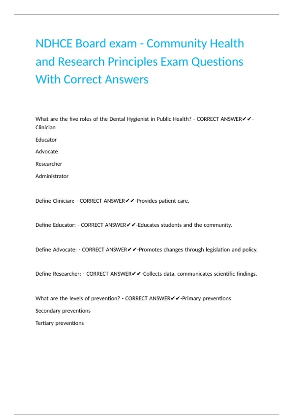 ,Define |Primary |preventions: |- |CORRECT |ANSWER✔✔-Prevents |the |onset |of |a |disease, |reverses