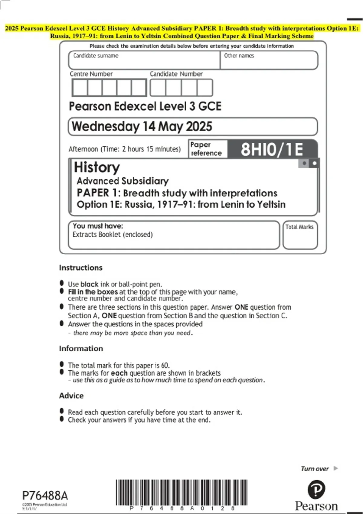 2025 Pearson Edexcel Level 3 GCE History Advanced Subsidiary PAPER 1: Breadth study with interpretations Option 1E: Russia, 1917–91: from Lenin to Yeltsin Combined Question paper and approved marking scheme