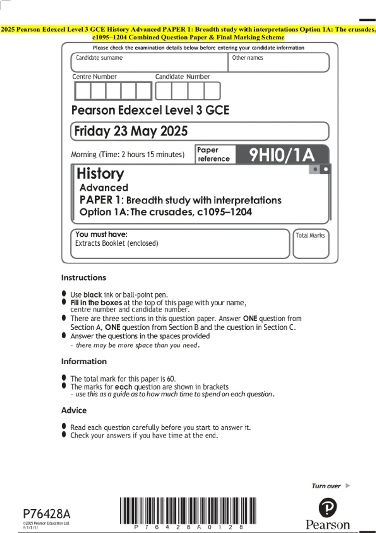 2025 Pearson Edexcel Level 3 GCE History Advanced PAPER 1: Breadth study with interpretations Option 1A: The crusades, c1095–1204 Combined Question paper and approved marking scheme