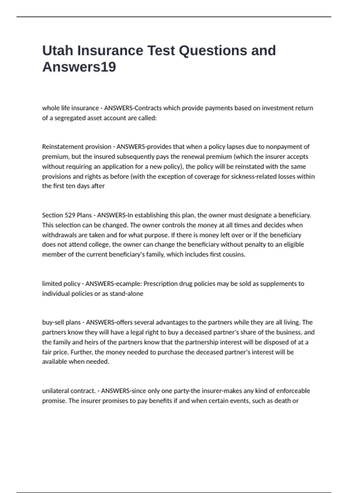 unilateral contract. - ANSWERS-since only one party-the insurer-makes any kind of enforceable