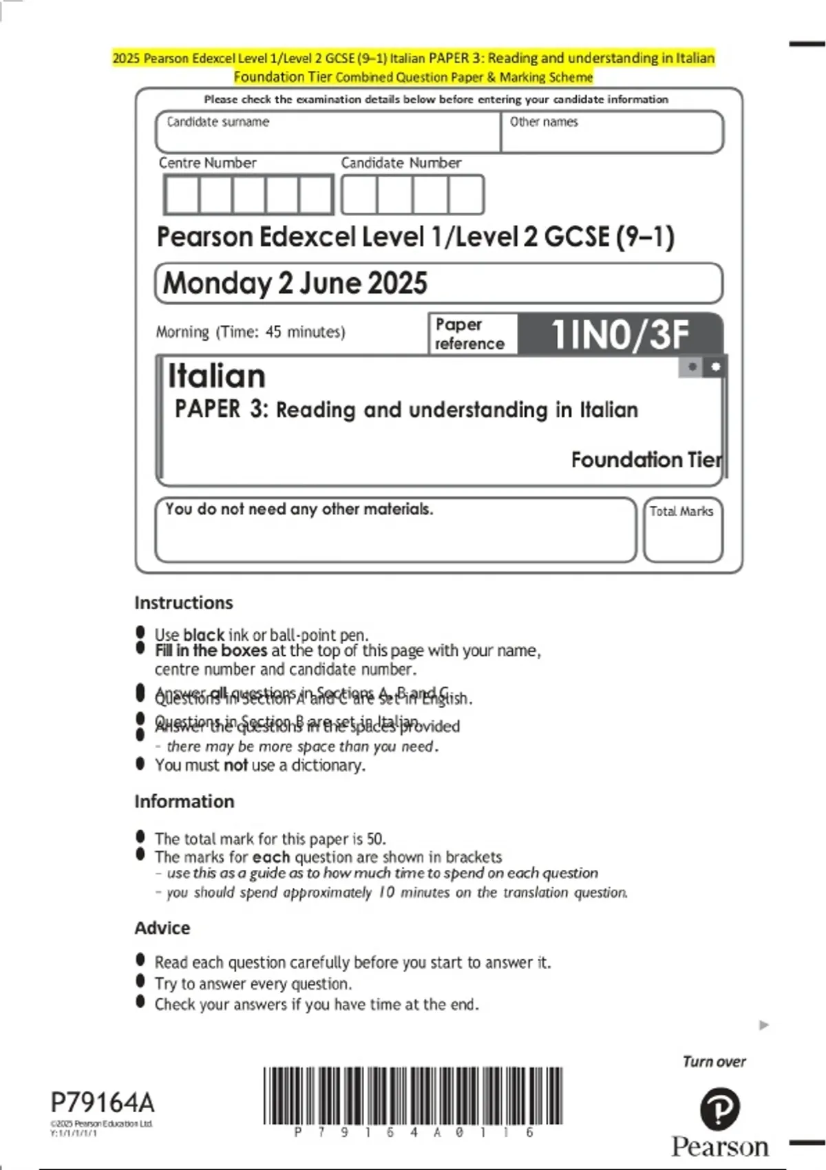 2025 Pearson Edexcel Level 1/Level 2 GCSE (9–1) Italian PAPER 3: Reading and understanding in Italian Foundation Tier Combined Question paper and approved marking scheme