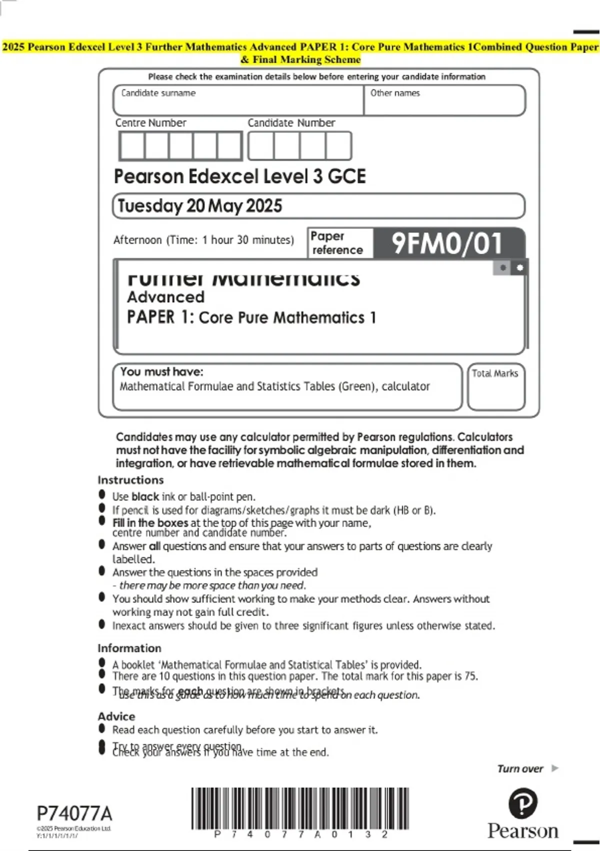 2025 Pearson Edexcel Level 3 Further Mathematics Advanced PAPER 1: Core Pure Mathematics 1Combined Question paper and approved marking scheme