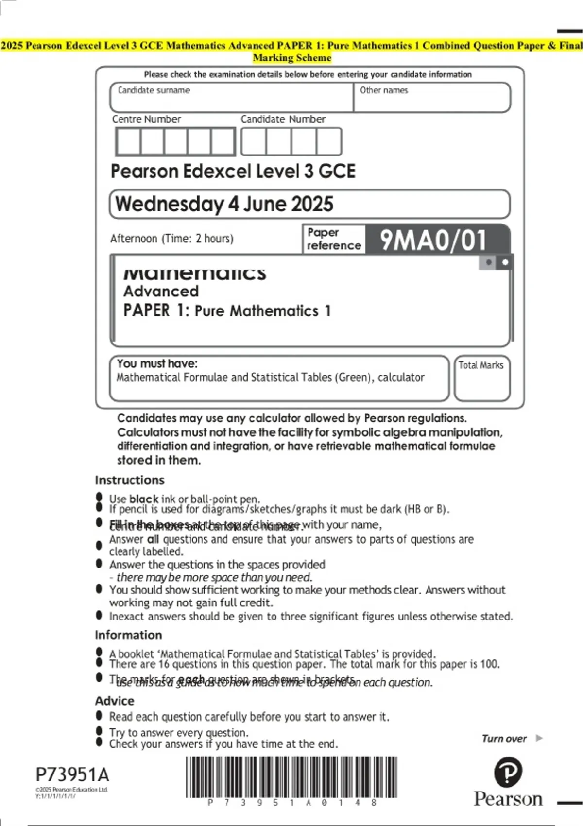 2025 Pearson Edexcel Level 3 GCE Mathematics Advanced PAPER 1: Pure Mathematics 1 Combined Question paper and approved marking scheme