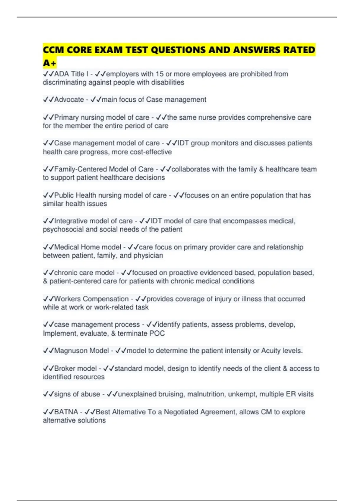 CCM CORE EXAM TEST QUESTIONS AND ANSWERS RATED A+