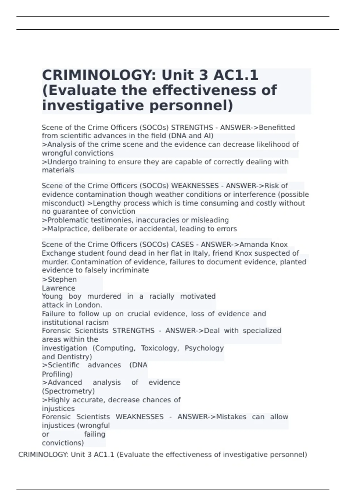 CRIMINOLOGY Unit 3 AC1.1 (Evaluate the effectiveness of investigative personnel)