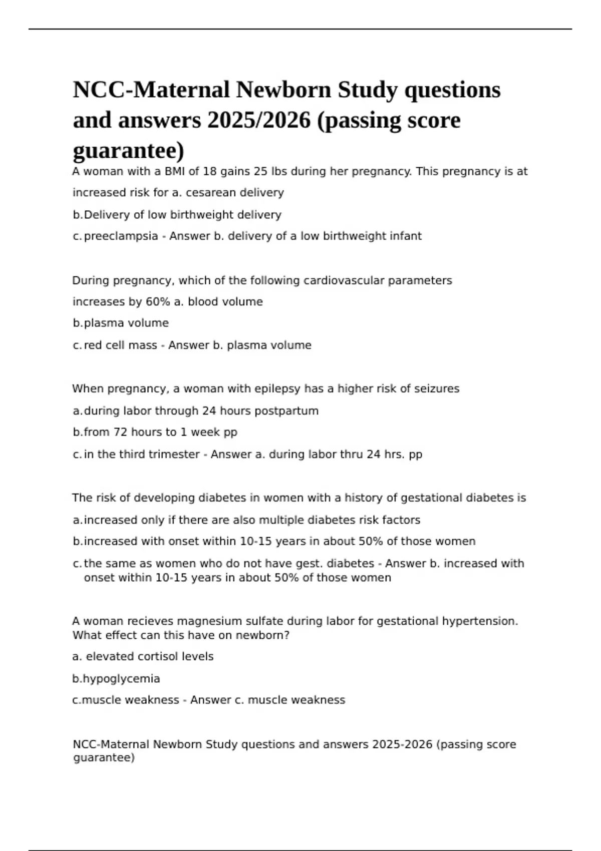 NCC-Maternal Newborn Study questions and answers (passing score guarantee)NCC-Maternal Newborn Study questions and answers (passing score guarantee)NCC-Maternal Newborn Study questions and answers (passing score guarantee)NCC-Maternal Newborn Study questions and answers (passing score guarantee)
