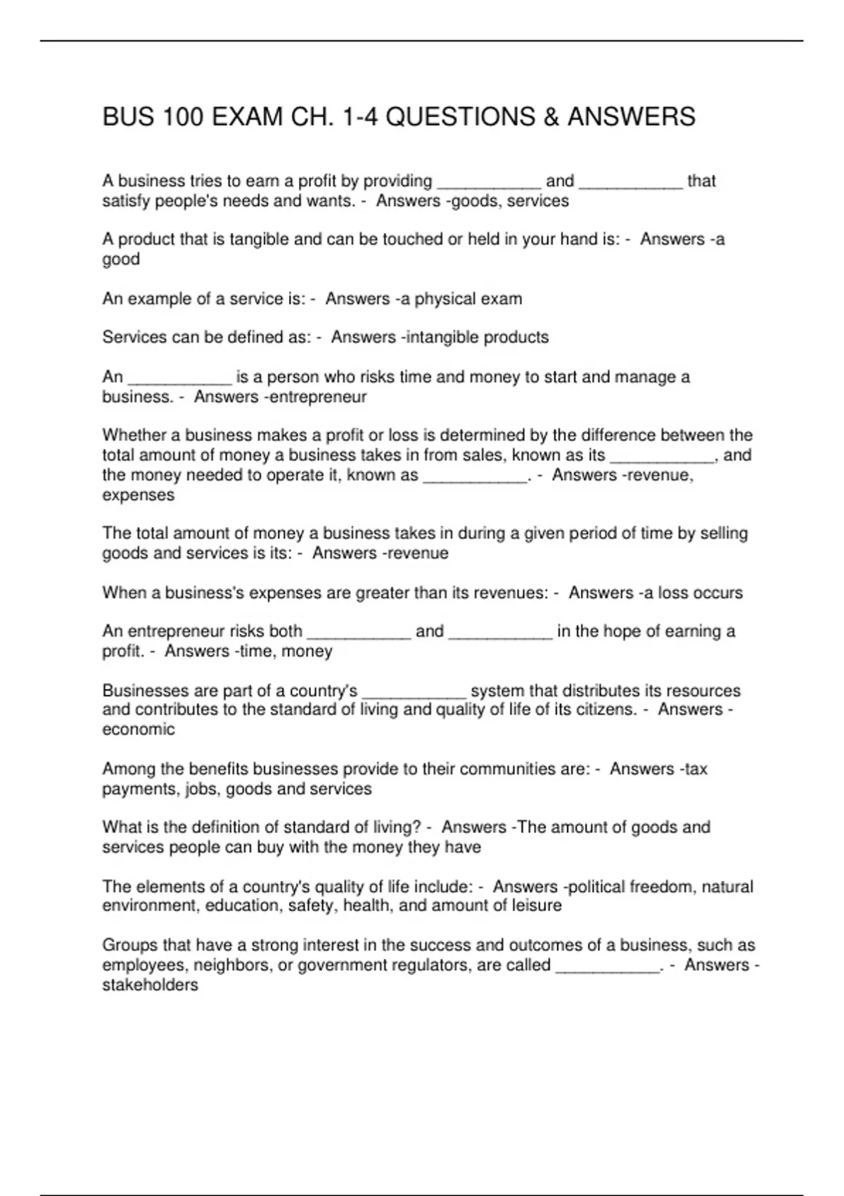 BUS 100 EXAM CH. 1-4 QUESTIONS & ANSWERS