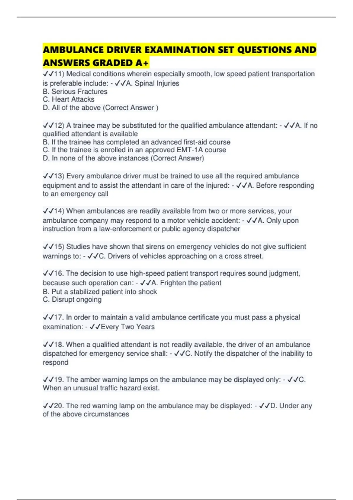 AMBULANCE DRIVER EXAMINATION SET QUESTIONS AND ANSWERS GRADED A+