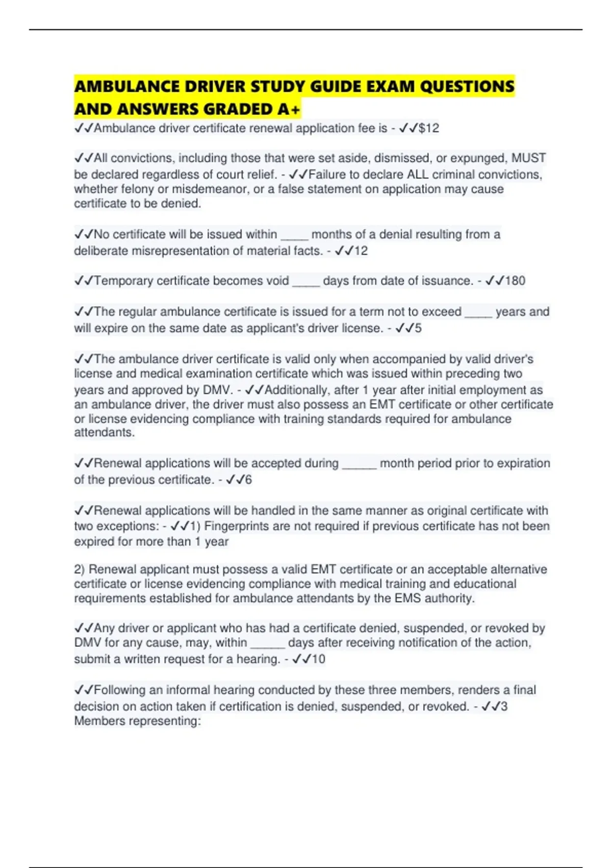 AMBULANCE DRIVER STUDY GUIDE EXAM QUESTIONS AND ANSWERS GRADED A+