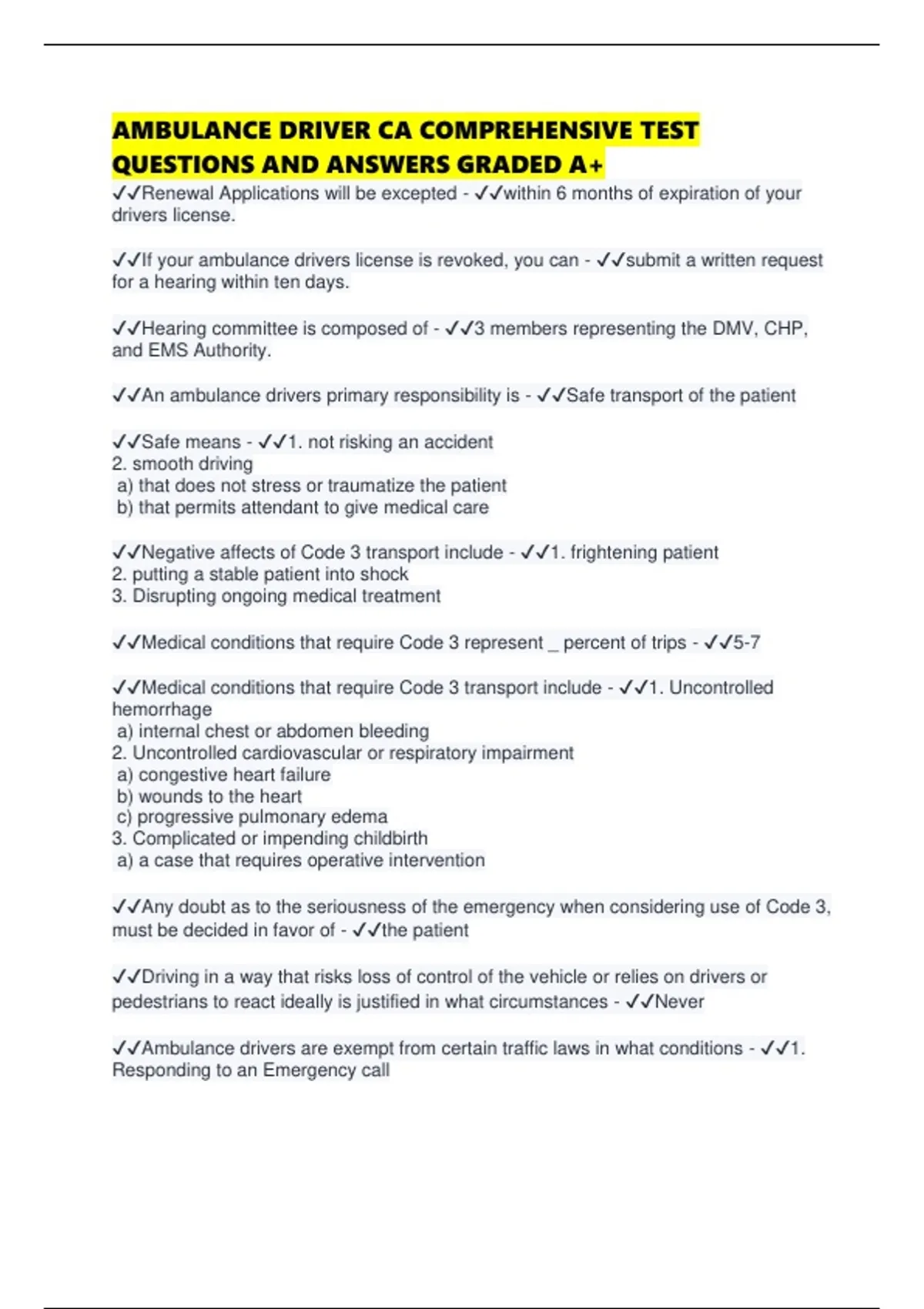✔✔Medical conditions that require Code 3 transport include - ✔✔1. Uncontrolled