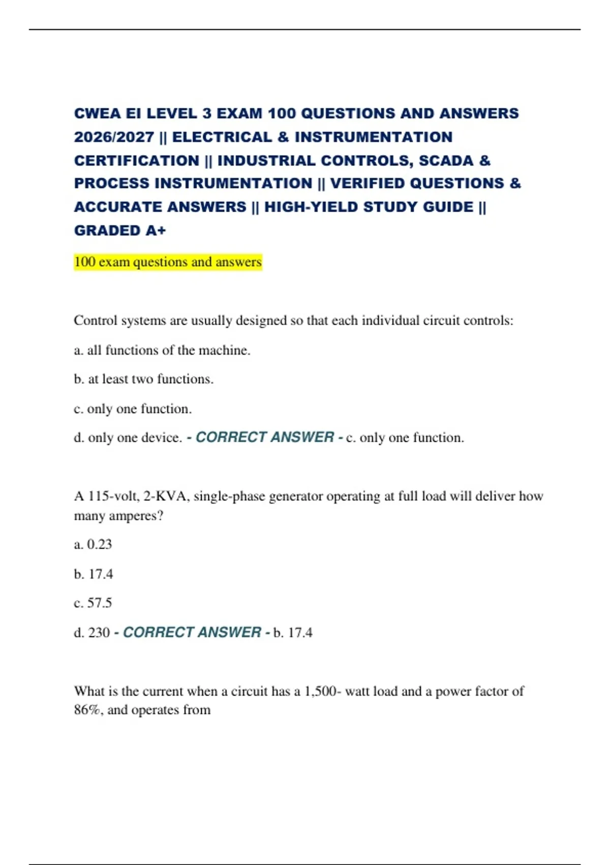 CWEA E/I LEVEL 3 EXAM 100 QUESTIONS AND ANSWERS 2026/2027 || ELECTRICAL & INSTRUMENTATION CERTIFICATION || INDUSTRIAL CONTROLS, SCADA & PROCESS INSTRUMENTATION || VERIFIED QUESTIONS & ACCURATE ANSWERS || HIGH-YIELD STUDY GUIDE || GRADED A+ 100 exam questions and answers Control systems are usually designed so that each individual circuit controls: a. all functions of the machine. b. at least two functions. c. only one function. d. only one device. - CORRECT ANSWER - c. only one function. A 115-volt, 2-KVA, single-phase generator operating at full load will deliver how many amperes? a. 0.23 b. 17.4 c. 57.5 d. 230 - CORRECT ANSWER - b. 17.4 What is the current when a circuit has a 1,500- watt load and a power factor of 86%, and operates from a three-phase 230-volt source? a. 9.7 amps b. 6.5 amps c. 4.4 amps d. 3.8 amps - CORRECT ANSWER - c. 4.4 amps