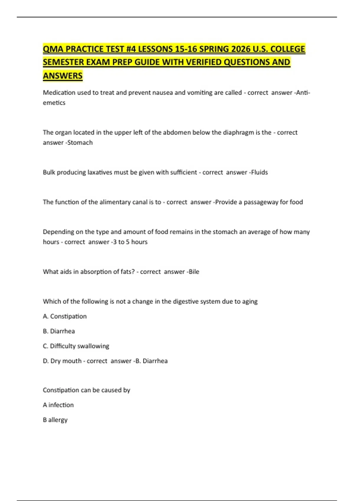 QMA PRACTICE TEST #4 LESSONS 15-16 SPRING 2026 U.S. COLLEGE SEMESTER EXAM PREP GUIDE WITH VERIFIED QUESTIONS AND ANSWERS