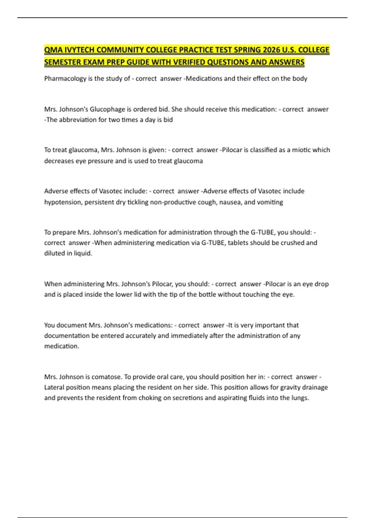 QMA IVYTECH COMMUNITY COLLEGE PRACTICE TEST SPRING 2026 U.S. COLLEGE
