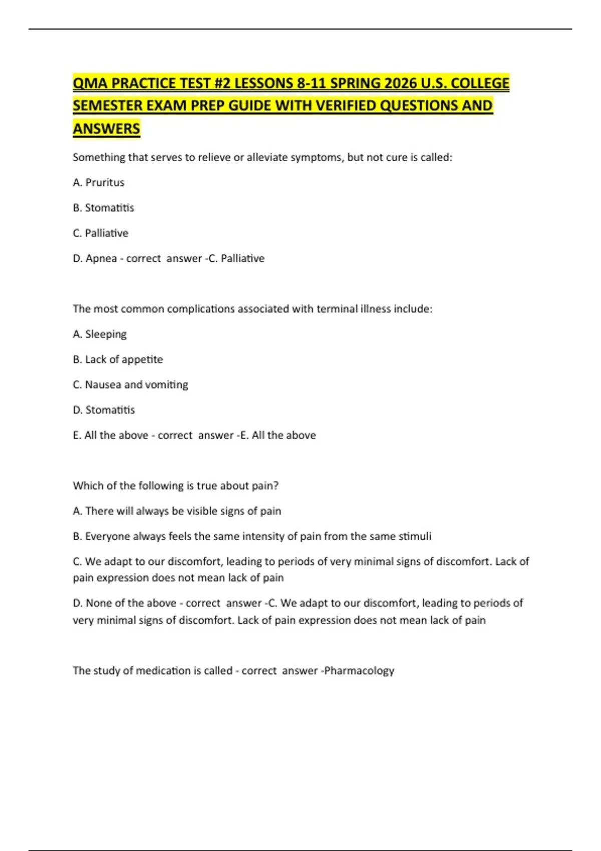 QMA PRACTICE TEST #2 LESSONS 8-11 SPRING 2026 U.S. COLLEGE