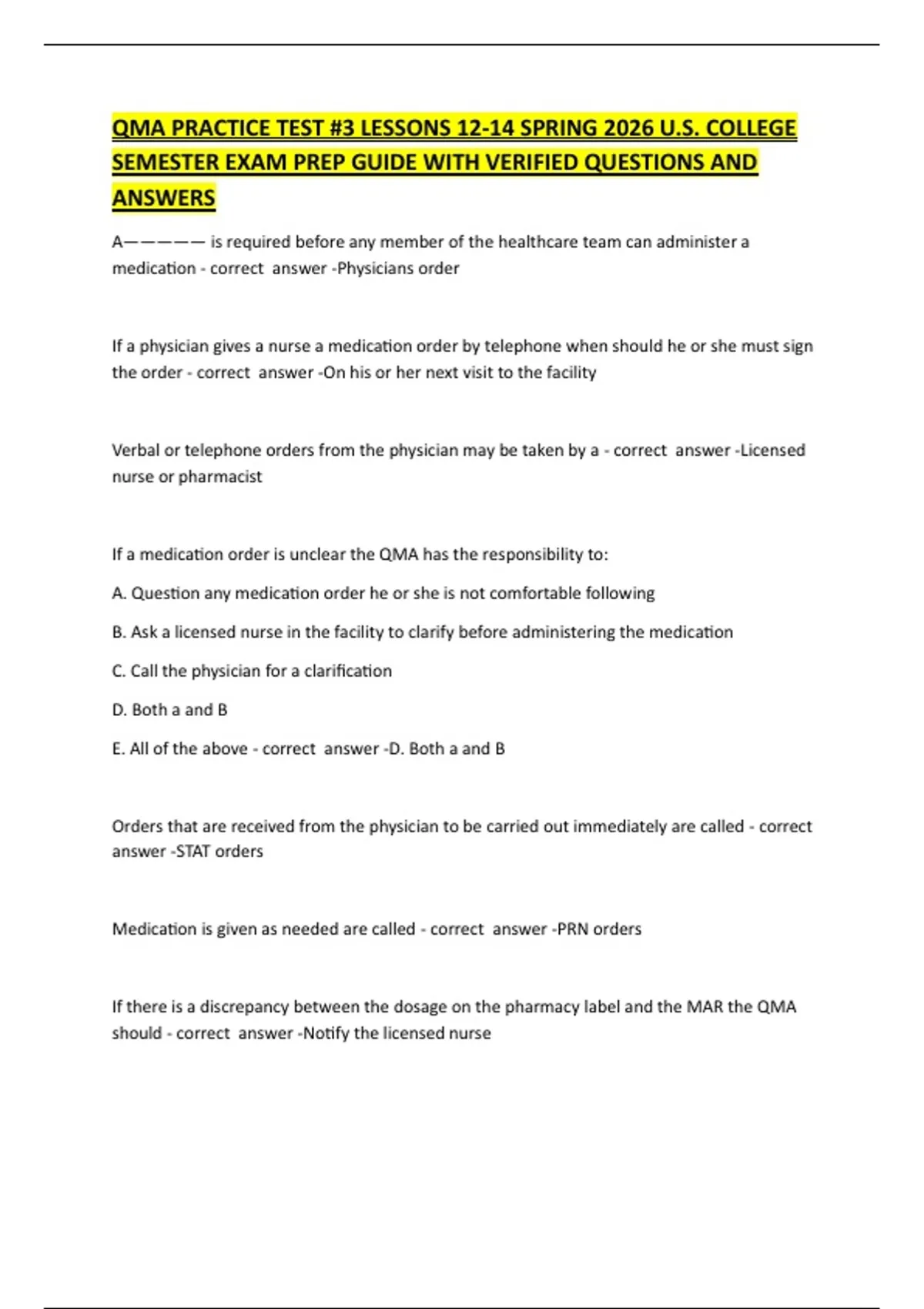 QMA PRACTICE TEST #3 LESSONS 12-14 SPRING 2026 U.S. COLLEGE