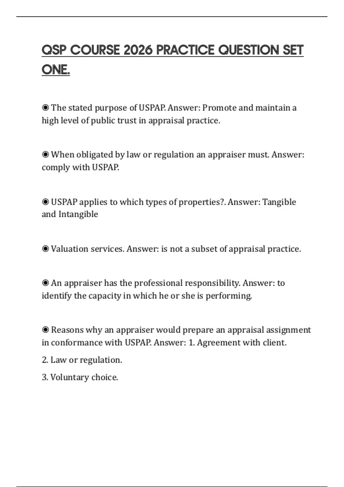 ◉ The stated purpose of USPAP. Answer: Promote and maintain a