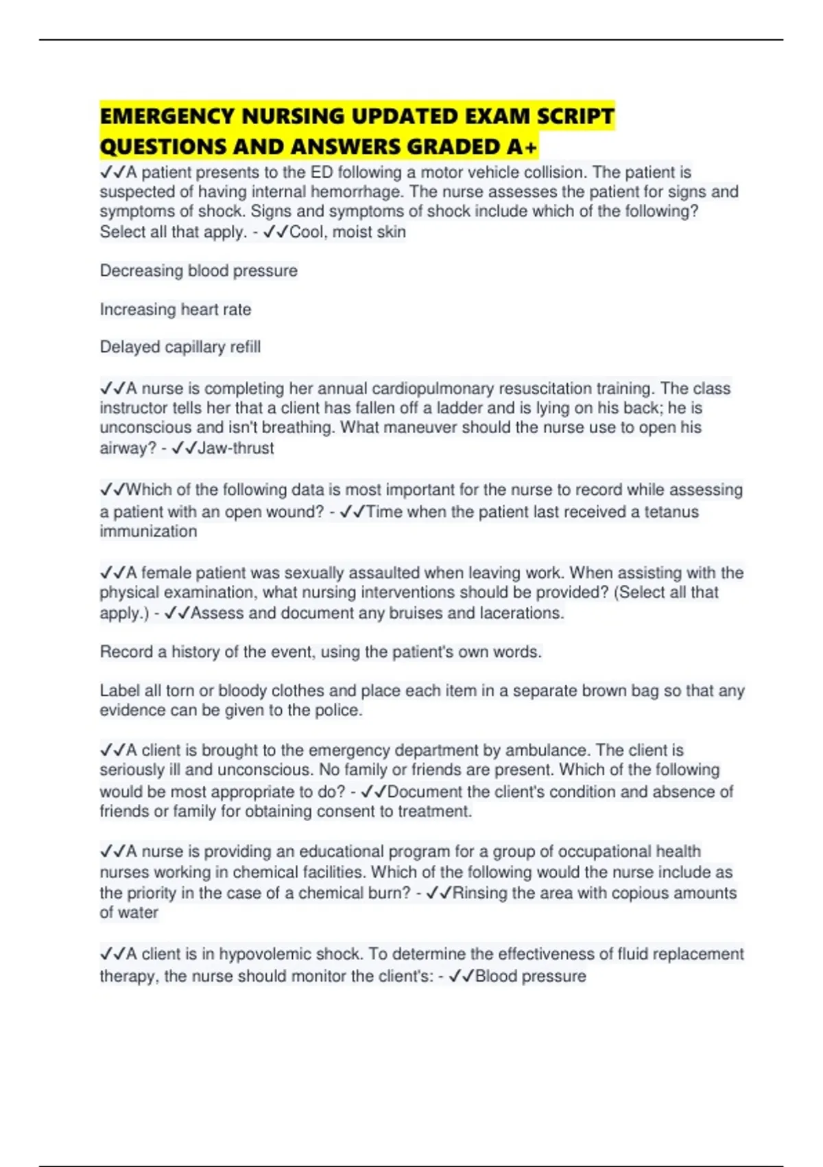 EMERGENCY NURSING UPDATED EXAM SCRIPT QUESTIONS AND ANSWERS GRADED A+