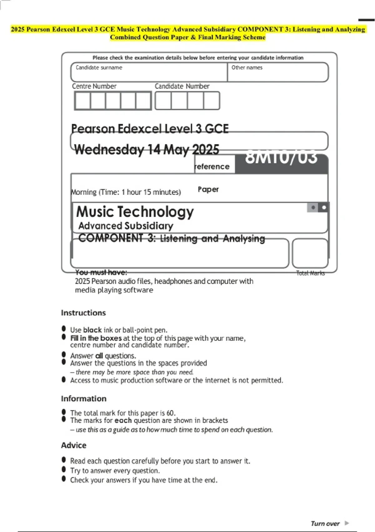 2025 Pearson Edexcel Level 3 GCE Music Technology Advanced Subsidiary COMPONENT 3: Listening and Analyzing Combined Question paper and approved marking scheme