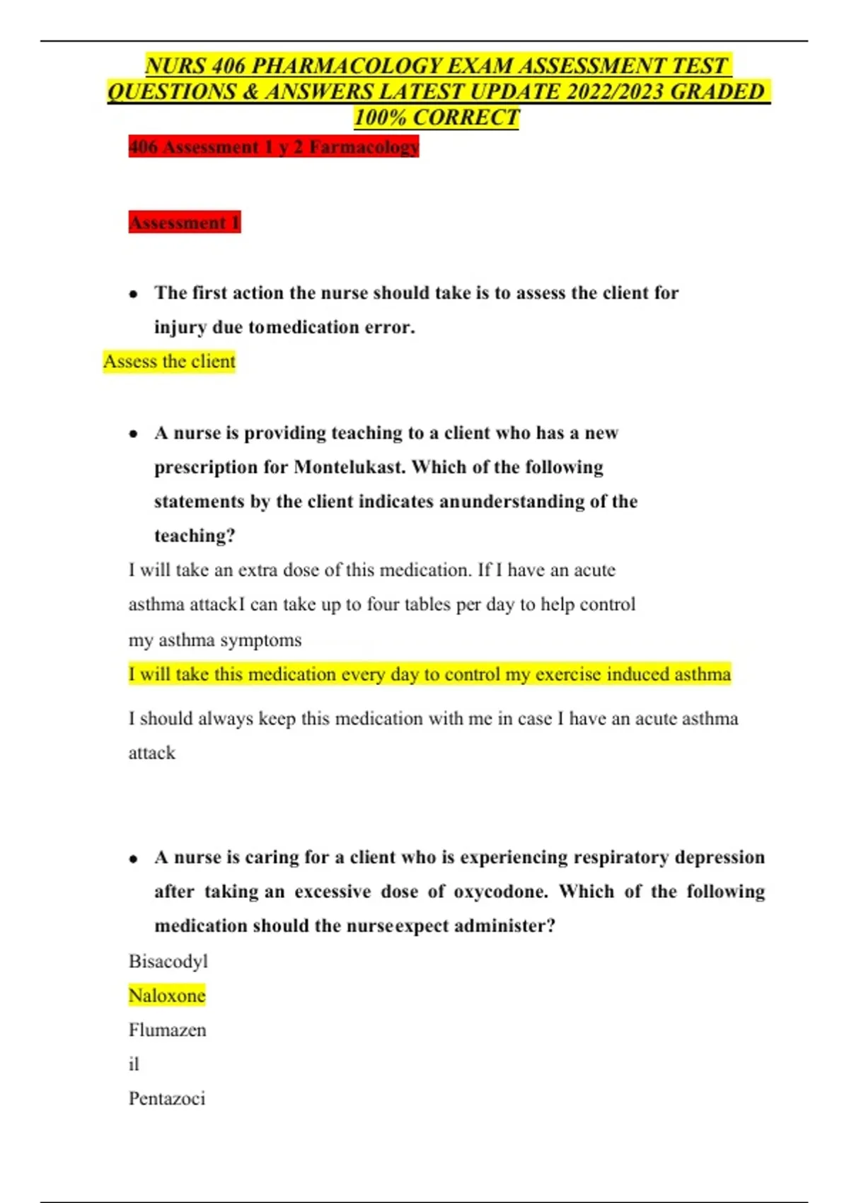 NURS 406 PHARMACOLOGY EXAM ASSESSMENT TEST