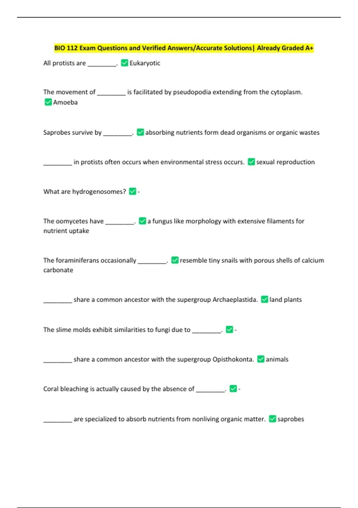BIO 112 Exam Questions and Verified Answers/Accurate Solutions