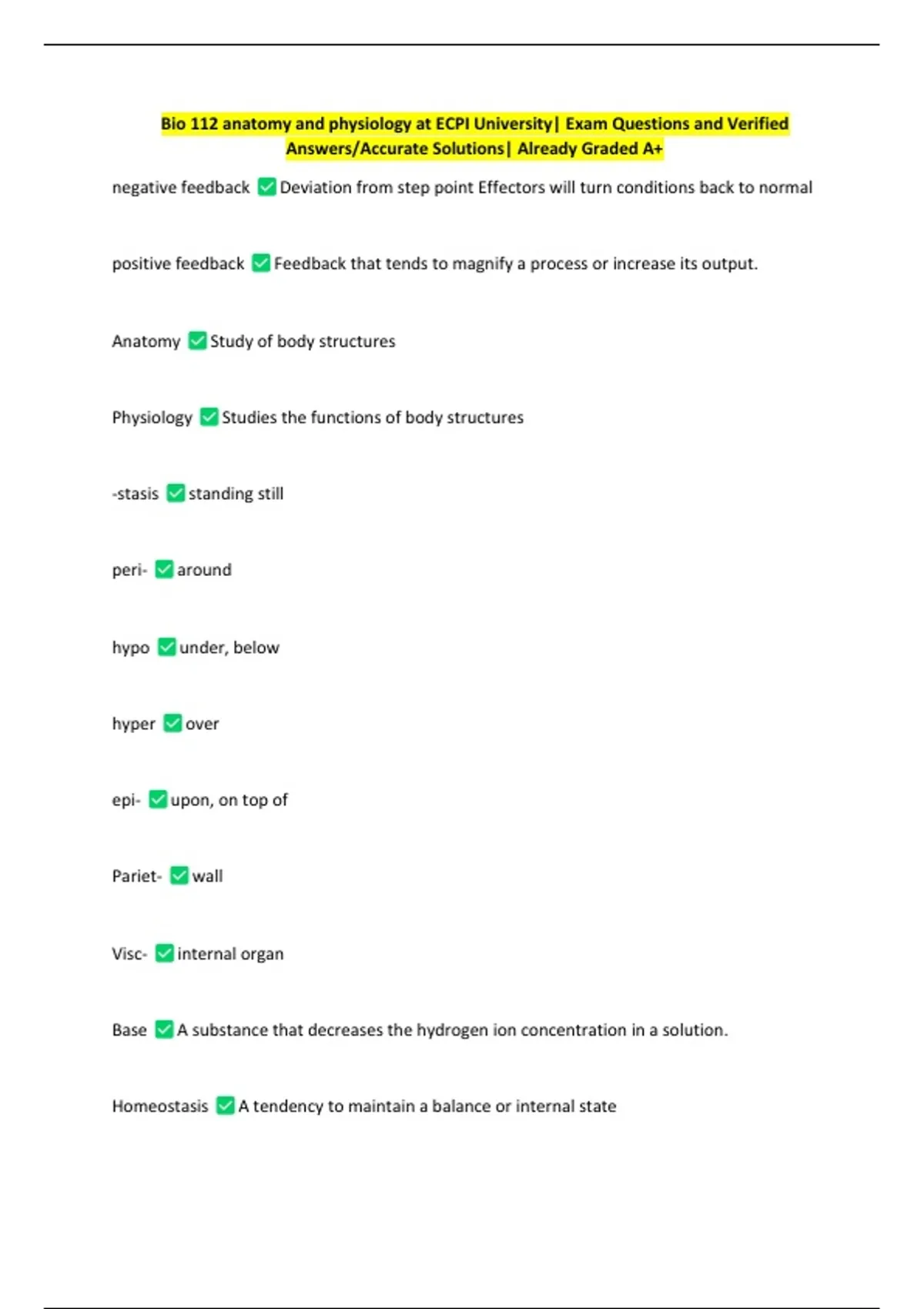 Bio 112 anatomy and physiology at ECPI University| Exam Questions and Verified