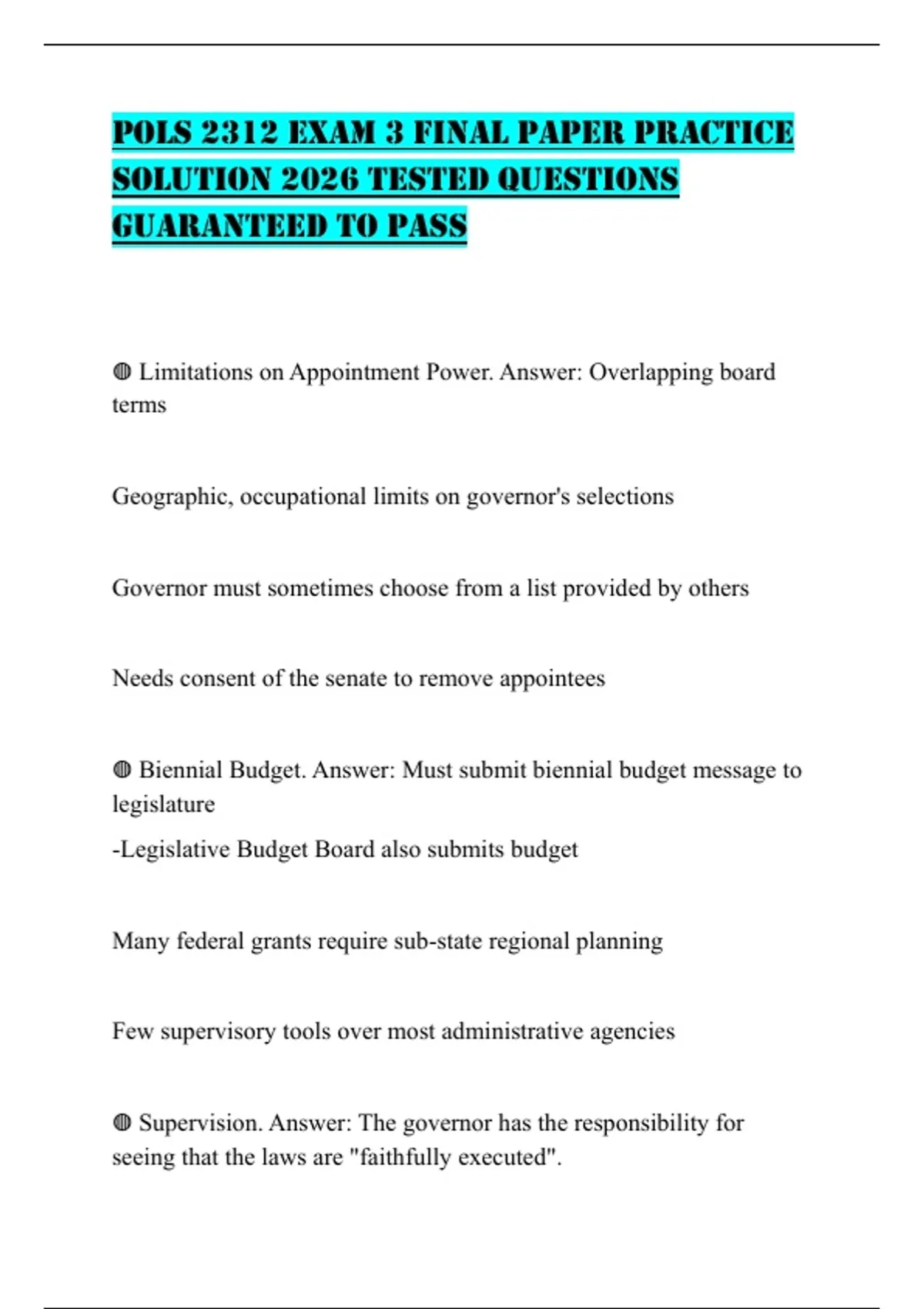POLS 2312 EXAM 3 FINAL PAPER PRACTICE SOLUTION 2026 TESTED QUESTIONS GUARANTEED TO PASS
