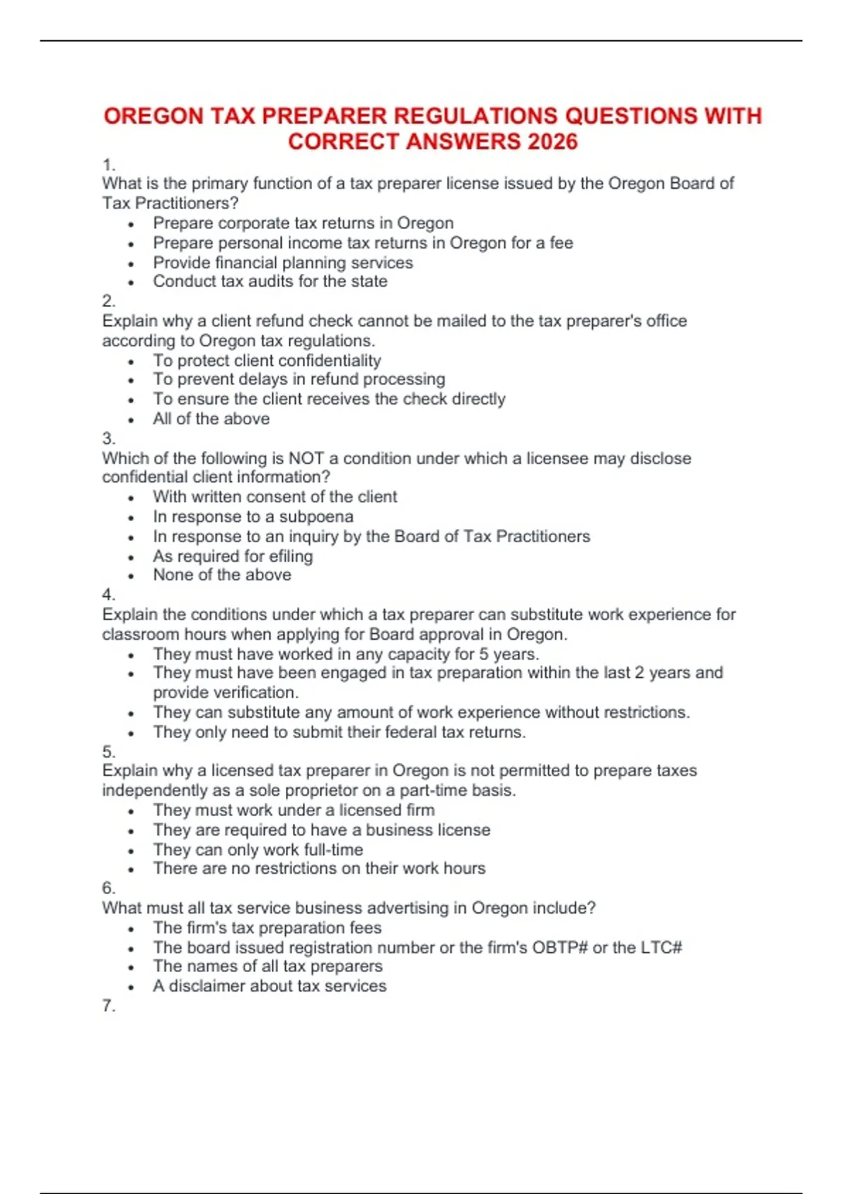 OREGON TAX PREPARER REGULATIONS QUESTIONS WITH