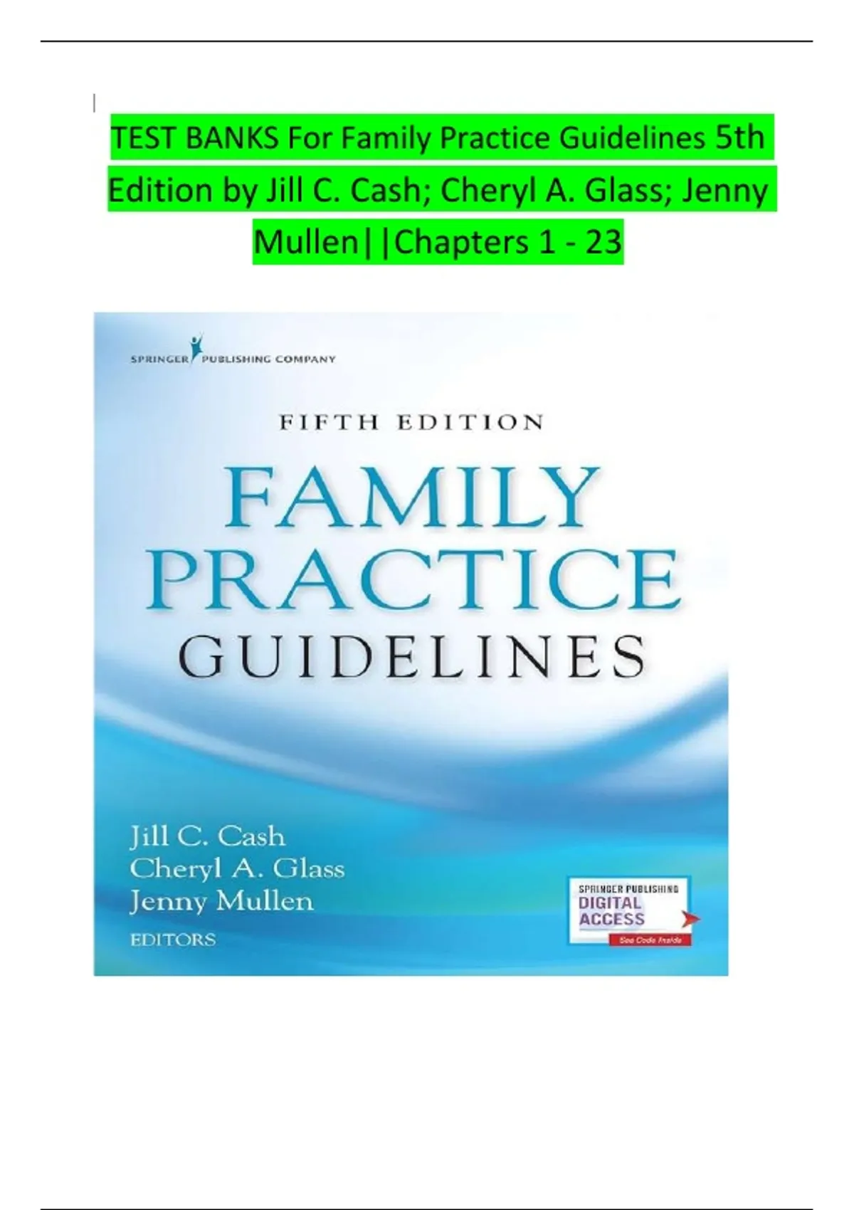 This test bank covers Chapters 1–23 of Family Practice Guidelines, 5th Edition by Jill C. Cash, Cheryl A. Glass, and Jenny Mullen, focusing on essential primary care and family practice topics. It includes comprehensive practice questions with answers designed to support exam preparation, clinical reasoning, and guideline-based decision-making for family nurse practitioner and primary care students.