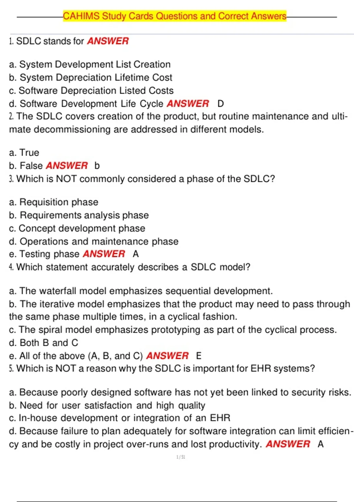 , CAHIMS Study Cards Questions and Correct Answers