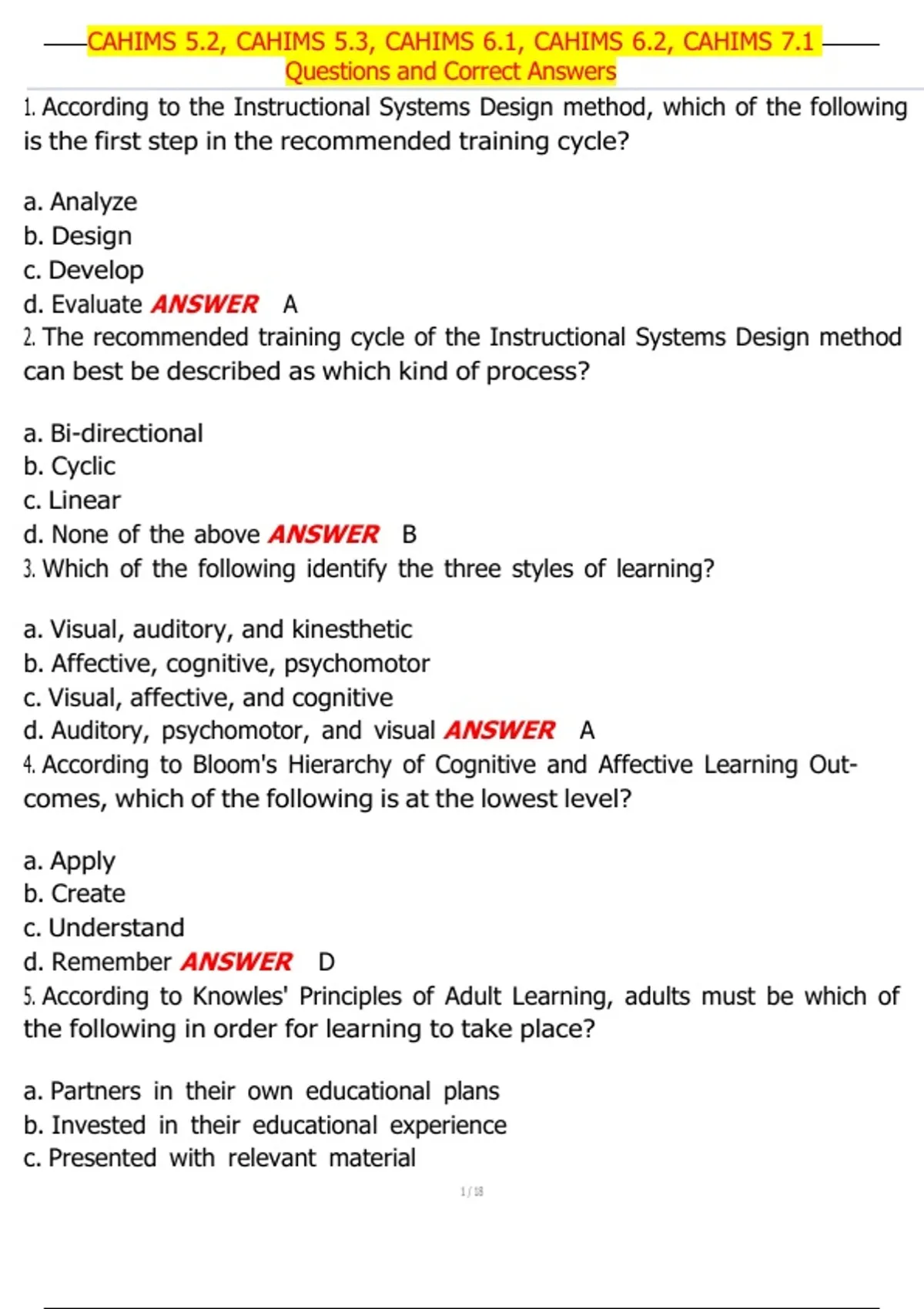 1. According to the Instructional Systems Design method, which of the following