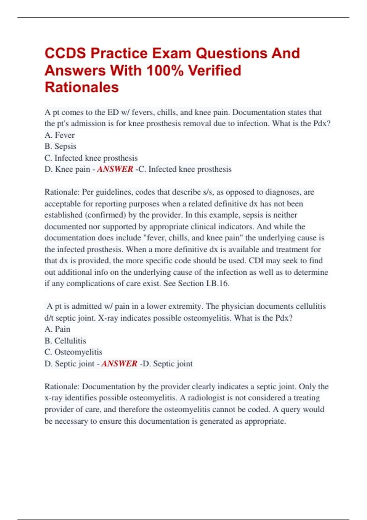 Rationale: Documentation by the provider clearly indicates a septic joint. Only the