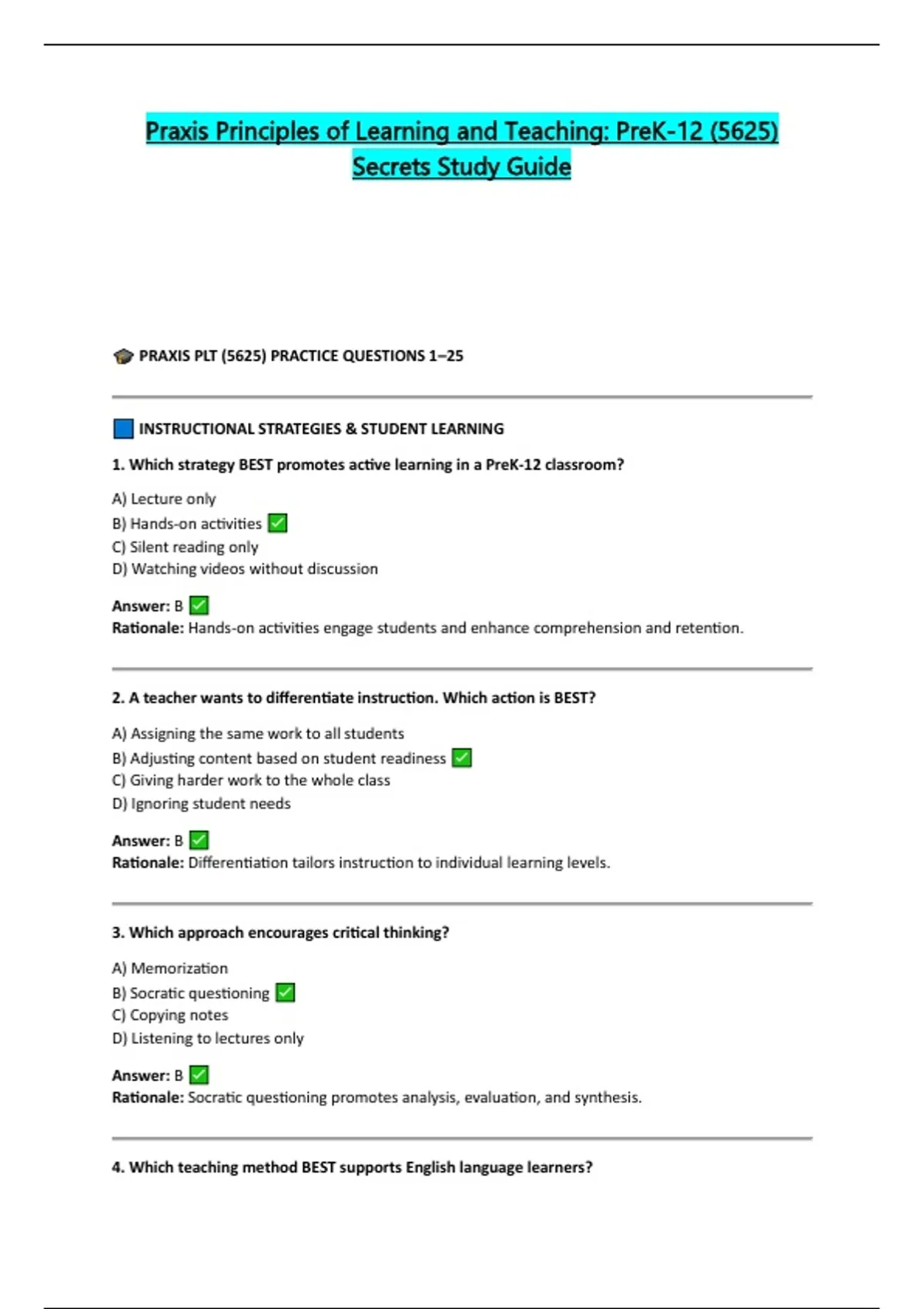 PRAXIS PLT (5625) PRACTICE QUESTIONS 1–25