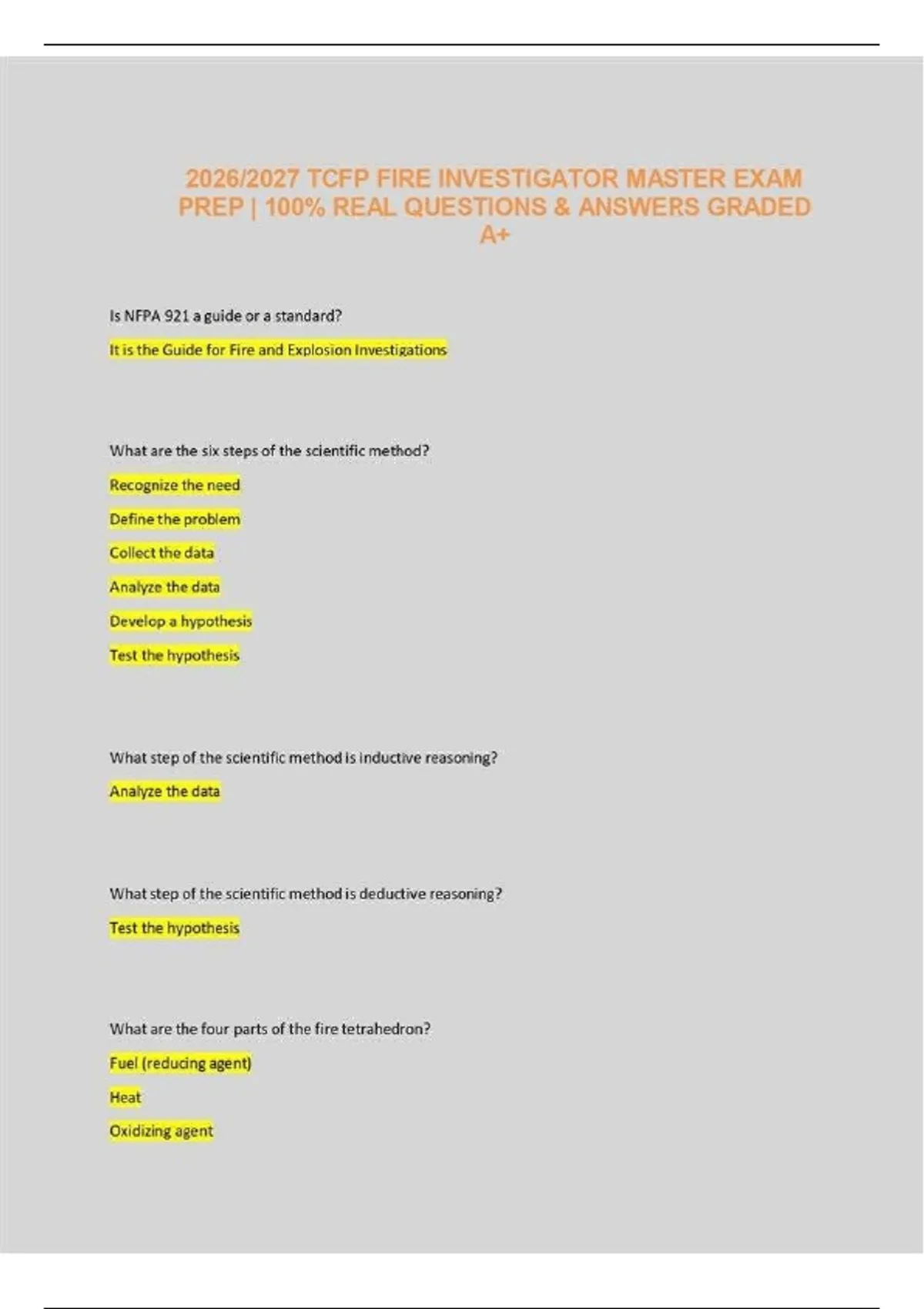 Unlock your path to the prestigious Master Fire Investigator certification with the most up-to-date and rigorous prep material available. The 2026/2027 TCFP Fire Investigator Master Exam Prep is specifically engineered for Texas fire service professionals who are ready to prove their expertise in the complex world of fire and explosion investigations. This comprehensive test bank features 100% real, verified questions and answers that align with the latest Texas Commission on Fire Protection (TCFP) curriculum standards and the most recent editions of NFPA 921 (Guide for Fire and Explosion Investigations) and NFPA 1033 (Standard for Professional Qualifications for Fire Investigator). Why the Master Level Matters The "Master" designation is the pinnacle of the TCFP fire investigation track. It signifies not just a basic understanding of fire origin and cause, but a deep, scientific command of fire dynamics, legal proceedings, and complex forensic analysis. In the 2026/2027 testing cycle, TCFP has increased the emphasis on the Scientific Method and Digital Evidence, making a targeted study tool more essential than ever. Inside the 2026/2027 Master Prep Bank This is more than a study guide; it is a simulation of the actual state exam. Every question is designed to challenge your critical thinking and ensure you are prepared for the nuances of the TCFP testing environment. 1. Core Pillar Coverage The test bank is organized into the specific domains required by the TCFP Curriculum Manual: Scientific Method & Basic Fire Science: Mastery of thermodynamics, heat transfer (conduction, convection, radiation), and the fire tetrahedron. Fire Patterns & Dynamics: Identifying plume-generated patterns, ventilation-controlled vs. fuel-controlled fires, and "clean burn" indicators. Origin & Cause Determination: Moving from the least damaged area to the most damaged, and identifying the first material ignited and the ignition source. Electricity & Fire: Analyzing arc mapping, overcurrent protection, and identifying electrical failures vs. fire-damaged wiring. Legal Considerations: Navigating the 4th Amendment, search and seizure laws (Michigan v. Tyler), and preparing for expert witness testimony. 2. Advanced Investigative Topics Master-level candidates are expected to handle specialized scenarios. Our bank includes: Vehicle & Marine Investigations: Fuel system failures and specialized fire patterns in modern EVs and internal combustion engines. Fatal Fire Investigations: Managing victims, understanding the effects of CO vs. HCN, and coordinating with the Medical Examiner. Explosion Dynamics: Differentiating between low-order and high-order explosions, and identifying diffuse vs. concentrated blast effects. Key Features and Benefits Real Exam Mirroring: Every question is formatted to match the TCFP style—focusing on situational judgment and technical accuracy. NFPA 1033 & 921 Integration: Stay compliant with the 2025/2026 updates to NFPA standards, including the latest on lithium-ion battery fire investigations. Step-by-Step Rationales: Don’t just learn the answer; learn the logic. We provide the specific NFPA chapter and section for every correct answer to facilitate deeper study. Scientific Method Focus: Extensive practice on the 7-step scientific method to ensure your investigative process stands up to legal scrutiny. Instant Digital Access: Download and start studying immediately on any device—perfect for use during downtime at the station. Strategic Study Path for Success To achieve a passing score on the first attempt, follow this Master-level study plan: The Baseline Test: Take 50 random questions to identify your "weak" systems (e.g., if you struggle with fuel gas systems or Ohm's Law). The "Why" Behind the Burn: Read the rationales for every question missed. Re-read the corresponding section in NFPA 921 to understand the physical science. Legal Review: Dedicate specific time to the "Legal Considerations" section, as this is where many experienced investigators lose points due to technicalities. Hypothesis Testing: Practice the questions regarding "Deductive Reasoning" and "Hypothesis Testing" until the process becomes second nature. Product Specifications Target: TCFP Master Fire Investigator Certification Cycle: 2026/2027 (Valid for current and upcoming testing windows) Format: Digital PDF / High-Resolution Text Reference Standards: NFPA 921, NFPA 1033, TCFP Curriculum Chapter 5 Note: This prep material is specifically designed for the Texas Commission on Fire Protection (TCFP) exam standards but is highly applicable to IAAI-CFI and NAFI-CFEI national certifications.