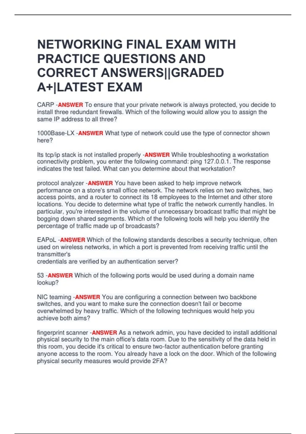 NETWORKING FINAL EXAM WITH PRACTICE QUESTIONS AND CORRECT ANSWERS||GRADED A+|LATEST EXAM