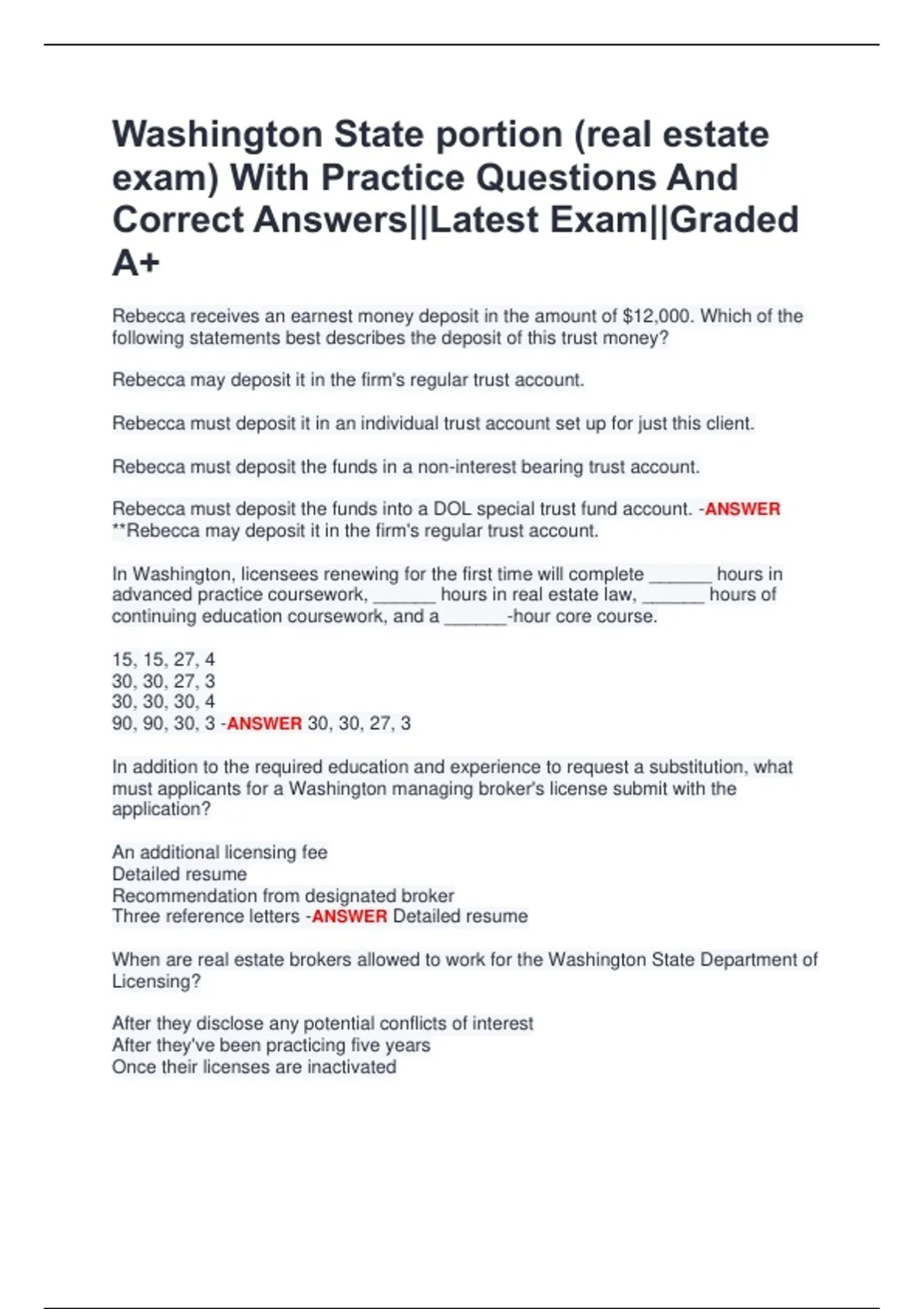 Washington State portion (real estate exam) With Practice Questions And Correct Answers||Latest Exam||Graded A+