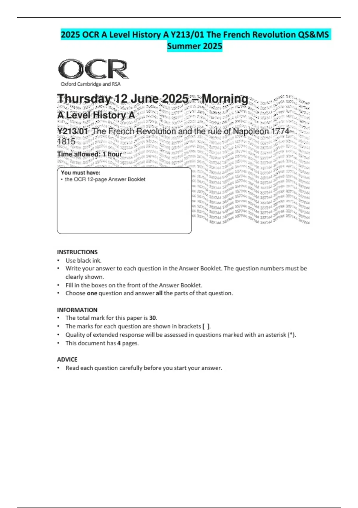 2025 OCR A Level History A Y213/01 The French Revolution QS&MS