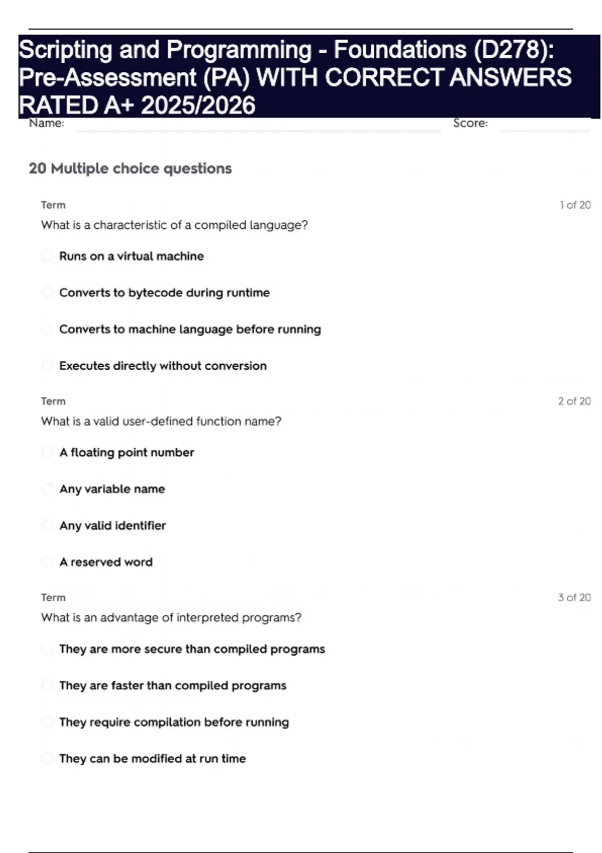 Scripting and Programming - Foundations (D278): Pre-Assessment (PA) WITH CORRECT ANSWERS RATED A+ 2025/2026