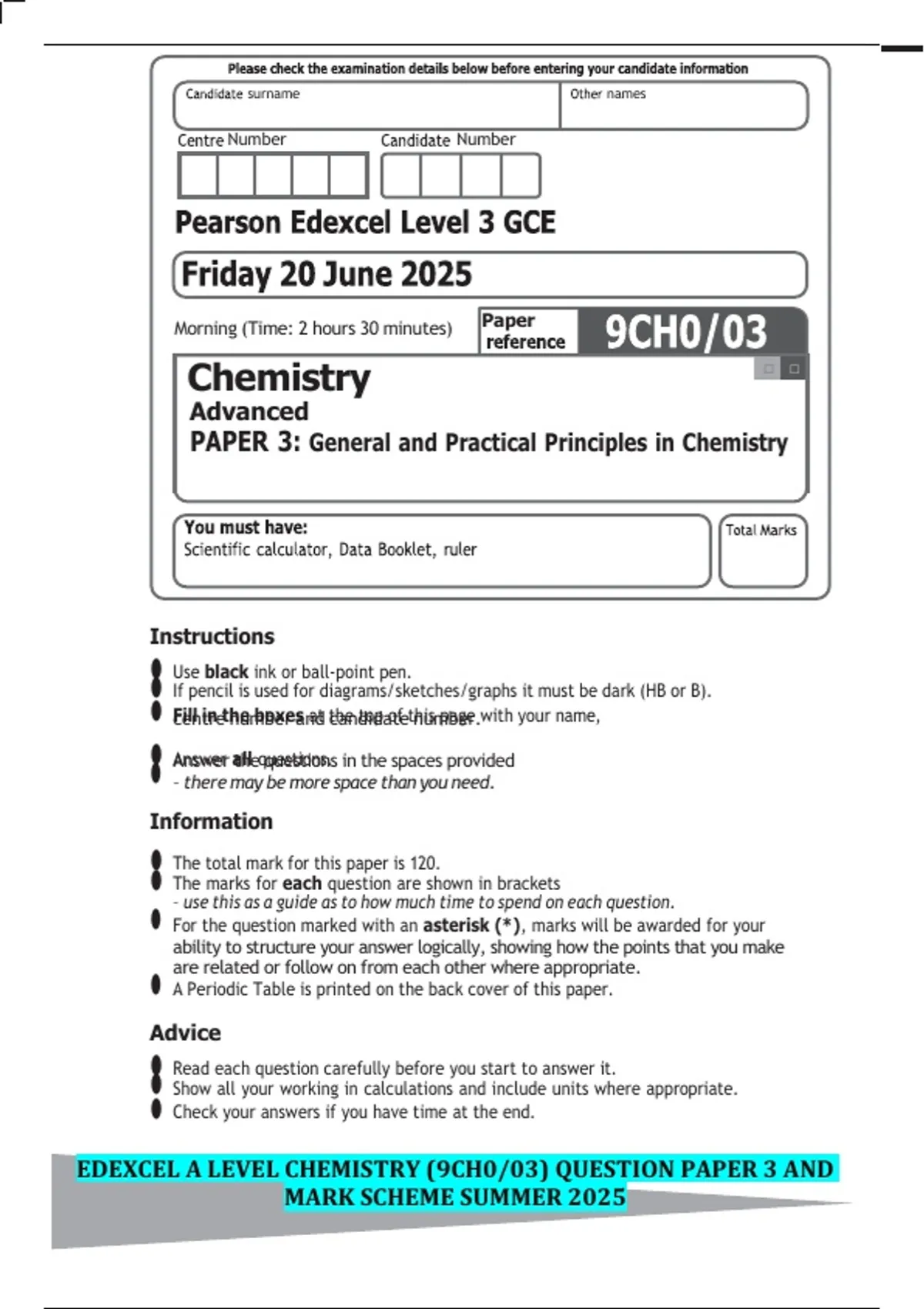 EDEXCEL A LEVEL CHEMISTRY (9CH0/03) QUESTION PAPER 3 AND