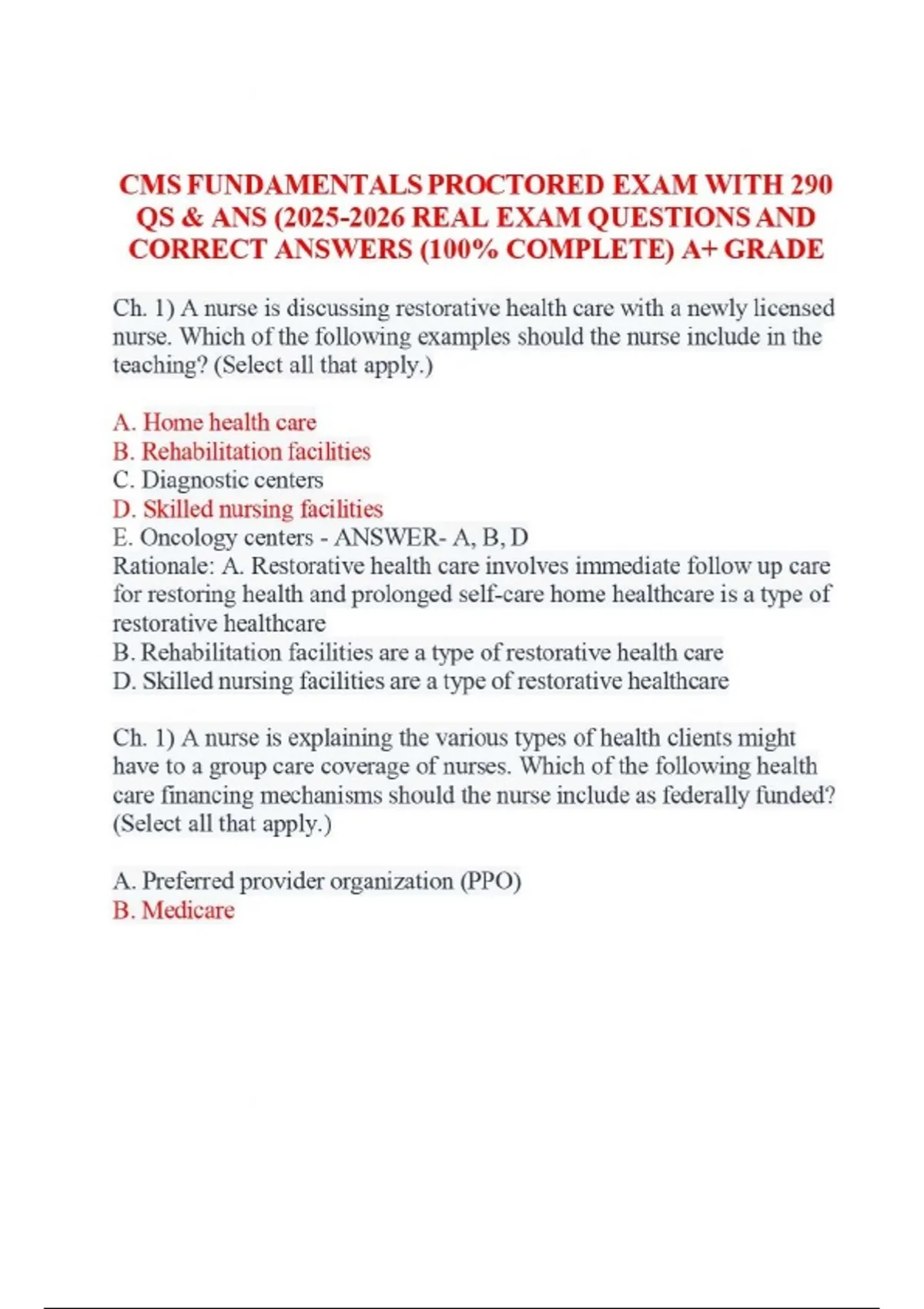 CMS FUNDAMENTALS PROCTORED EXAM WITH 290 QS & ANS ( REAL EXAM QUESTIONS AND CORRECT ANSWERS (100% COMPLETE) A+ GRADE