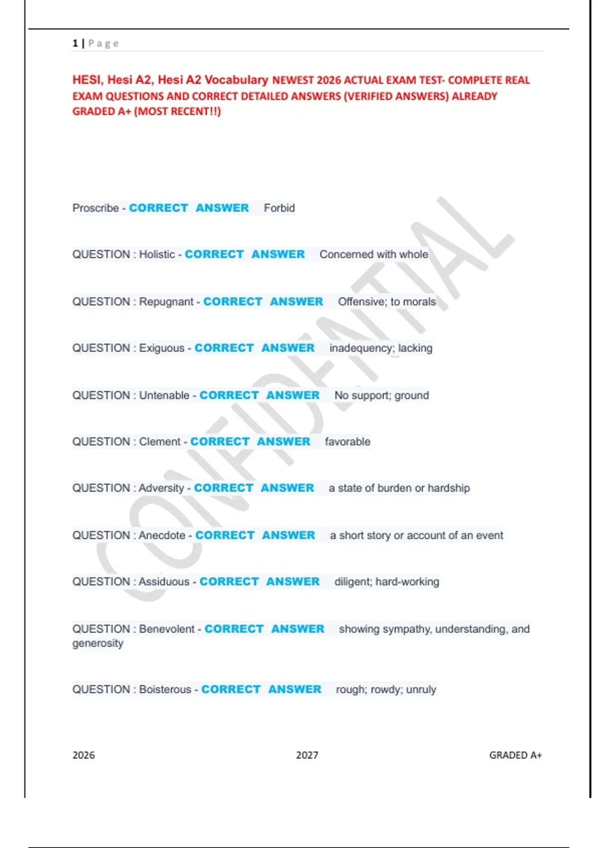 HESI, Hesi A2, Hesi A2 Vocabulary NEWEST 2026 ACTUAL EXAM TEST- COMPLETE REAL
