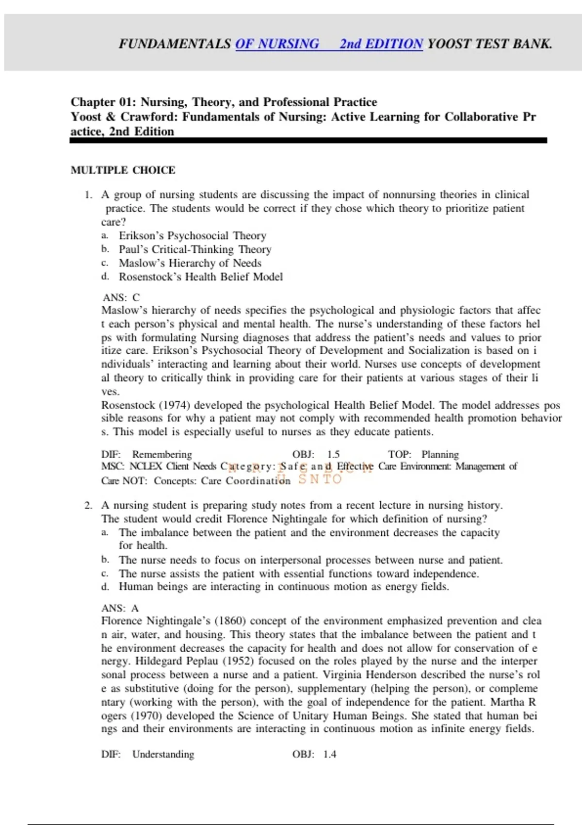FUNDAMENTALS OF NURSING 2nd EDITION YOOST TEST BANK.