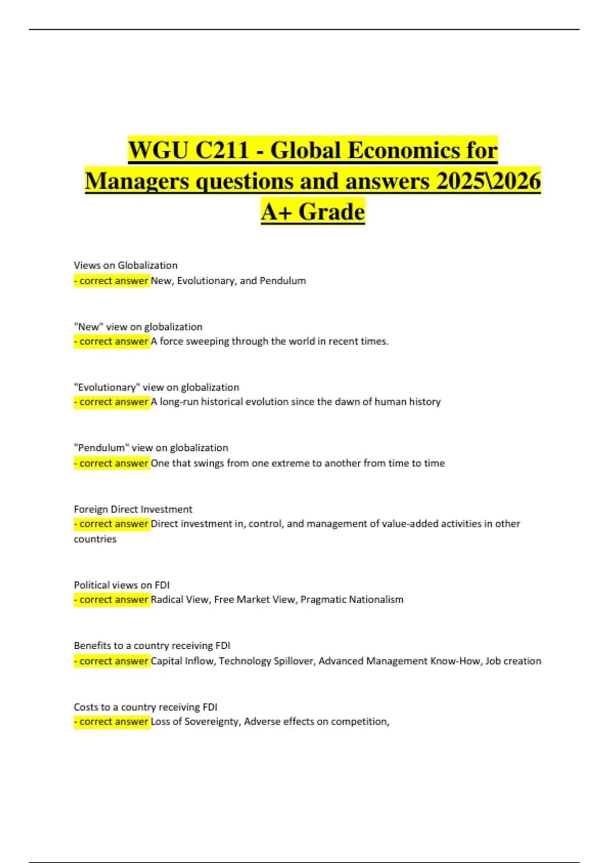 - correct answer Capital Inflow, Technology Spillover, Advanced Management Know-How, Job creation