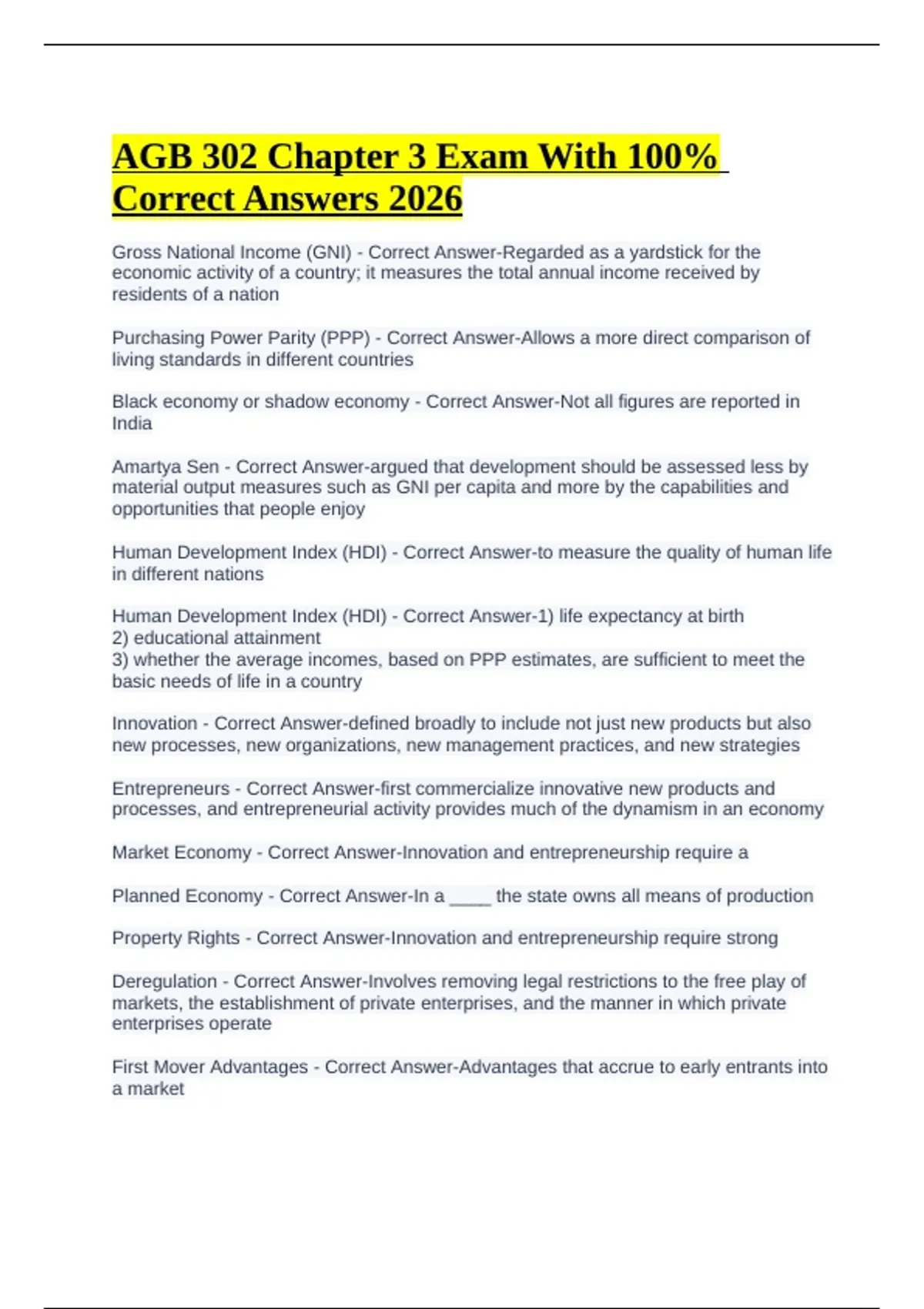AGB 302 Chapter 3 Exam With 100% Correct Answers 2026 Gross National Income (GNI) - Correct Answer-Regarded as a yardstick for the economic activity of a country; it measures the total annual income received by residents of a nation Purchasing Power Parity (PPP) - Correct Answer-Allows a more direct comparison of living standards in different countries Black economy or shadow economy - Correct Answer-Not all figures are reported in India Amartya Sen - Correct Answer-argued that development should be assessed less by material output measures such as GNI per capita and more by the capabilities and opportunities that people enjoy Human Development Index (HDI) - Correct Answer-to measure the quality of human life in different nations Human Development Index (HDI) - Correct Answer-1) life expectancy at birth 2) educational attainment 3) whether the average incomes, based on PPP estimates, are sufficient to meet the basic needs of life in a country