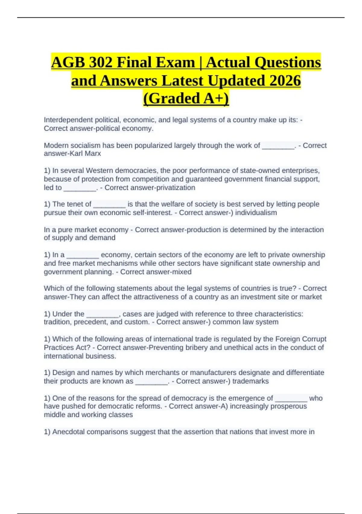 AGB 302 Final Exam | Actual Questions and Answers Latest Updated 2026 (Graded A+) Interdependent political, economic, and legal systems of a country make up its: - Correct answer-political economy. Modern socialism has been popularized largely through the work of ________. - Correct answer-Karl Marx 1) In several Western democracies, the poor performance of state-owned enterprises, because of protection from competition and guaranteed government financial support, led to ________. - Correct answer-privatization 1) The tenet of ________ is that the welfare of society is best served by letting people pursue their own economic self-interest. - Correct answer-) individualism In a pure market economy - Correct answer-production is determined by the interaction of supply and demand 1) In a ________ economy, certain sectors of the economy are left to private ownership and free market mechanisms while other sectors have significant state ownership and government planning. - Correct answer-mixed Which of the following statements about the legal systems of countries is true? - Correct answer-They can affect the attractiveness of a country as an investment site or market 1) Under the ________, cases are judged with reference to three characteristics: tradition, precedent, and custom. - Correct answer-) common law system 1) Which of the following areas of international trade is regulated by the Foreign Corrupt Practices Act? - Correct answer-Preventing bribery and unethical acts in the conduct of international business. 1) Design and names by which merchants or manufacturers designate and differentiate their products are known as ________. - Correct answer-) trademarks 1) One of the reasons for the spread of democracy is the emergence of ________ who have pushed for democratic reforms. - Correct answer-A) increasingly prosperous middle and working classes 1) Anecdotal comparisons suggest that the assertion that nations that invest more in ________ will have higher growth rates is true. - Correct answer-B) education 1) Several of the fastest-growing Asian economies adopted more ________ governments during the past three decades, including South Korea and Taiwan. - Correct answer-D) democratic 1) Which of the following helps in adjusting GNI such that it accounts for the differences in the cost of living? - Correct answer-A) Purchasing power parity (PPP) adjustment 1) Which of the following is a measure that is developed by the United Nations to measure the quality of life in different nations? - Correct answer-Human Development Index 1) ________, a Nobel Prize-winning economist, has argued that development is not just an economic process, but it is a political one as well. - Correct answer-Amartya Sen A market economy encourages innovation because - Correct answer-economic freedom leads to greater incentives for innovation 1) The state can expropriate the profits from innovation through legal means, such as ________. - Correct answer-excessive taxation 1) A free market economy in which property rights are protected leads to subsequent economic growth, which often leads to the establishment of: - Correct answer-a democratic regime. 1) Which of the following is a step in the shift toward a market-based economic system? - Correct answer-Creation of a legal system to safeguard property rights 1) A Japanese executive's ritual of presenting a business card to a foreign business executive is an example of . - Correct answer-folkways 1) Which of the following statements about values and norms of a culture is true? - Correct answer-A) The values and norms of a society influence social structure. 1) Which of the following is a consequence of the emphasis on individual performance in many Western societies? - Correct answer-A) High degree of managerial mobility 1) Which of the following is a closed system of stratification in which social position is