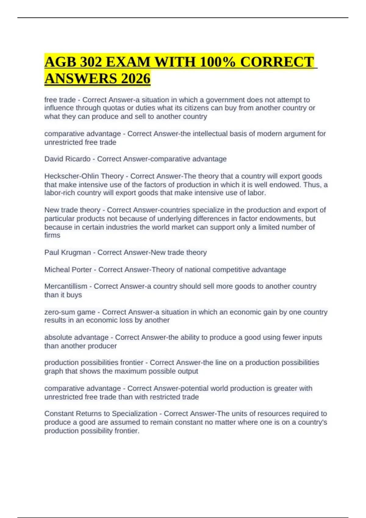 AGB 302 EXAM WITH 100% CORRECT ANSWERS 2026 free trade - Correct Answer-a situation in which a government does not attempt to influence through quotas or duties what its citizens can buy from another country or what they can produce and sell to another country comparative advantage - Correct Answer-the intellectual basis of modern argument for unrestricted free trade David Ricardo - Correct Answer-comparative advantage Heckscher-Ohlin Theory - Correct Answer-The theory that a country will export goods that make intensive use of the factors of production in which it is well endowed. Thus, a labor-rich country will export goods that make intensive use of labor. New trade theory - Correct Answer-countries specialize in the production and export of particular products not because of underlying differences in factor endowments, but because in certain industries the world market can support only a limited number of firms Paul Krugman - Correct Answer-New trade theory Micheal Porter - Correct Answer-Theory of national competitive advantage Mercantillism - Correct Answer-a country should sell more goods to another country than it buys zero-sum game - Correct Answer-a situation in which an economic gain by one country results in an economic loss by another absolute advantage - Correct Answer-the ability to produce a good using fewer inputs than another producer production possibilities frontier - Correct Answer-the line on a production possibilities graph that shows the maximum possible output comparative advantage - Correct Answer-potential world production is greater with unrestricted free trade than with restricted trade Constant Returns to Specialization - Correct Answer-The units of resources required to produce a good are assumed to remain constant no matter where one is on a country's production possibility frontier. Factor Endowments - Correct Answer-A country's endowment with resources such as land, labor, and capital. Leontief Paradox - Correct Answer-The empirical finding that, in contrast to the predictions of the Heckscher-Ohlin theory, US exports are less capital intensive than US imports. economies of scale - Correct Answer-unit cost reductions associated with a large scale of output first-mover advantage - Correct Answer-The ability of an innovative company to achieve long-term competitive advantages by being the first to offer a certain product in the marketplace Theory of Absolute Advantage - Correct Answer-suggests that a country should specialize in producing goods in areas where it has an absolute advantage and import goods in areas where other countries have absolute advantages. Theory of Comparative Advantage - Correct Answer-suggests that opening a country to free trade stimulates economic growth, which creates dynamic gains from trade. Heckscher-Ohlin Theory - Correct Answer-argues that the pattern of international trade is determined by differences in factor endowments. Product Life Theory - Correct Answer-suggests that trade patterns are influenced by where a new product is introduced. New trade theory - Correct Answer-states that trade allows a nation to specialize in the production of certain goods, attaining scale economies and lowering the costs of producing those goods, while buying goods that it does not produce from other nations that are similarly specialized. Porter's Theory of National Competitive Advantage - Correct Answer-A) factor endowments B) domestic demand conditions C) related and supporting industries D) firm strategy, structure, and rivalry Theories of international trade - Correct Answer-important to international trade can and do exert a strong influence on government policy toward trade General Agreement on Tariffs and Trade (GATT) - Correct Answer-International treaty that committed signatories to lowering barriers to the free flow of goods across national borders and led to the WTO Tariff