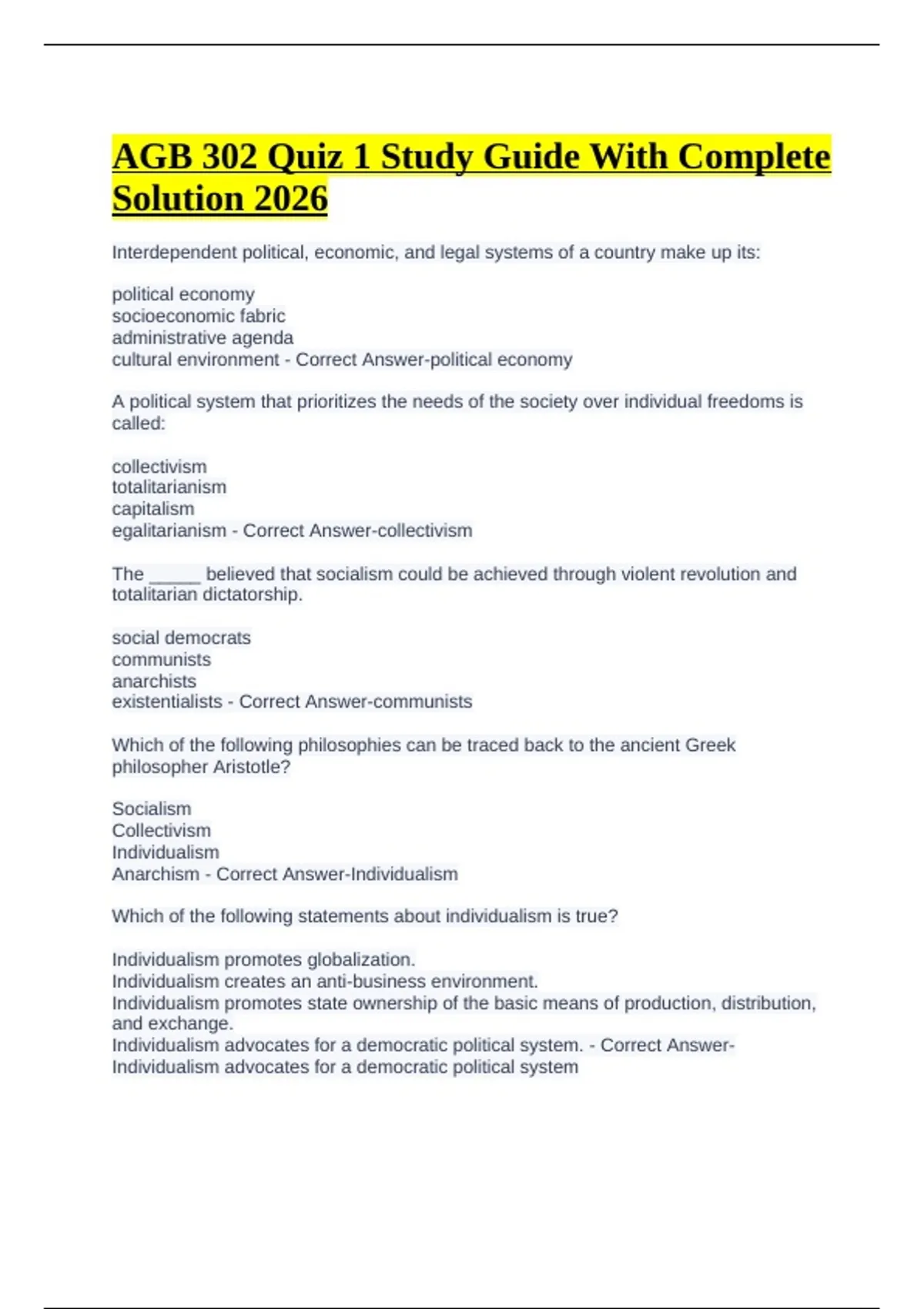 AGB 302 Quiz 1 Study Guide With Complete Solution 2026 AGB 302 Quiz 1 Study Guide With Complete Solution 2026 Interdependent political, economic, and legal systems of a country make up its: political economy socioeconomic fabric administrative agenda cultural environment - Correct Answer-political economy A political system that prioritizes the needs of the society over individual freedoms is called: collectivism totalitarianism capitalism egalitarianism - Correct Answer-collectivism The _____ believed that socialism could be achieved through violent revolution and totalitarian dictatorship. social democrats communists anarchists existentialists - Correct Answer-communists Which of the following philosophies can be traced back to the ancient Greek philosopher Aristotle? Socialism Collectivism Individualism Anarchism - Correct Answer-Individualism Which of the following statements about individualism is true? Individualism promotes globalization. Individualism creates an anti-business environment. Individualism promotes state ownership of the basic means of production, distribution, and exchange. Individualism advocates for a democratic political system. - Correct Answer-Individualism advocates for a democratic political system