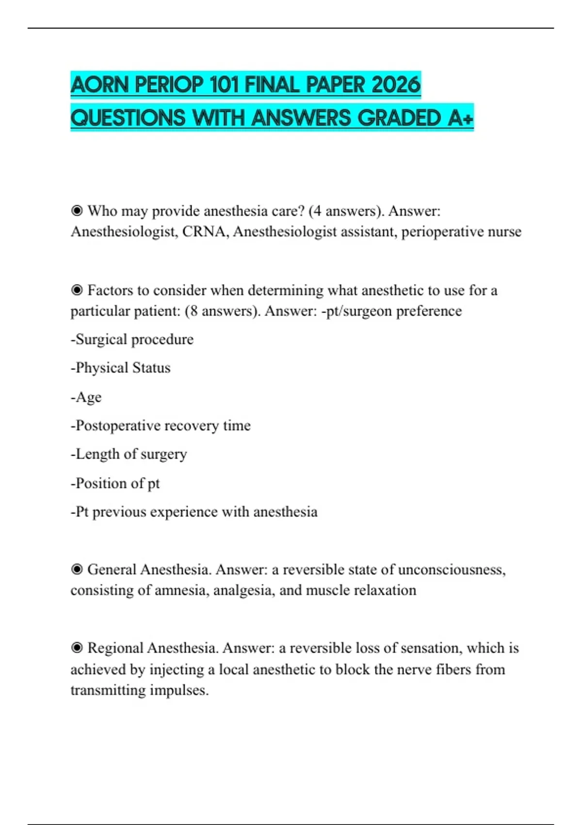 AORN PERIOP 101 FINAL PAPER 2026 QUESTIONS WITH ANSWERS GRADED A+