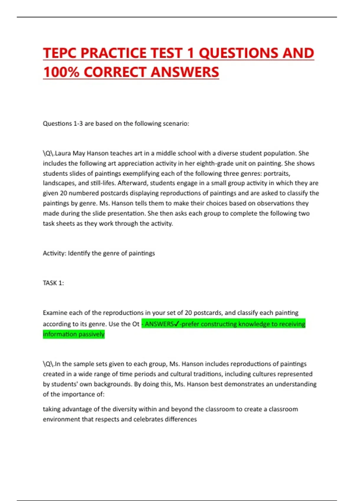 TEPC PRACTICE TEST 1 QUESTIONS AND 100% CORRECT ANSWERS Questions 1-3 are based on the following scenario: Q.Laura May Hanson teaches art in a middle school with a diverse student population. She includes the following art appreciation activity in her eighth-grade unit on painting. She shows students slides of paintings exemplifying each of the following three genres: portraits, landscapes, and still-lifes. Afterward, students engage in a small group activity in which they are given 20 numbered postcards displaying reproductions of paintings and are asked to classify the paintings by genre. Ms. Hanson tells them to make their choices based on observations they made during the slide presentation. She then asks each group to complete the following two task sheets as they work through the activity. Activity: Identify the genre of paintings TASK 1: Examine each of the reproductions in your set of 20 postcards, and classify each painting according to its genre. Use the Ot - ANSWERS-prefer constructing knowledge to receiving information passively Q.In the sample sets given to each group, Ms. Hanson includes reproductions of paintings created in a wide range of time periods and cultural traditions, including cultures represented by students' own backgrounds. By doing this, Ms. Hanson best demonstrates an understanding of the importance of: taking advantage of the diversity within and beyond the classroom to create a classroom environment that respects and celebrates differences fostering students' view of learning as a purposeful pursuit that is meaningful to them taking into account students' individual strengths and learning styles in order to design instruction that maximizes learning for a diverse student population helping students make connections between their prior learning experiences and those that are new to them - ANSWERS-taking advantage of the diversity within and beyond the classroom to create a classroom environment that respects and celebrates differences Q.Jamie is a student in Ms. Hanson's class who has a learning disability that is likely to make it difficult for him to participate fully in the group classification activity. Ms. Hanson can best fulfill her legal and professional responsibilities toward this student by taking which of the following steps first? providing Jamie with a related alternative activity that he could work on independently and complete successfully arranging for Jamie to complete the activity in the resource room with the support of the special education teacher developing roles and responsibilities for the members of each group so as to involve Jamie productively in the group activity assigning a partner to work with Jamie during the activity who will help guide him to the correct answers - ANSWERS-providing Jamie with a related alternative activity that he could work on independently and complete successfully Q.During the slide presentation and the explanation of the activity, students sit in rows of chairs facing the front of the room. After Ms. Hanson has finished giving the instructions for the activity, each group of students moves to a round table at the back of the room with the postcards and task sheets. During the next class meeting, Ms. Hanson arranges students' chairs in a semicircle so students can all see one another. She selects a representative from each small group to report to the rest of the class on the group's findings. During each representative's report, the other members of the group display or pass around each postcard for the rest of the class to see. Once each group's findings have been reported, Ms. Hanson engages the whole class in a discussion of issues and questions that have emerged from the painting-classification activity. Throughout this sequence of events, Ms. Hanson demonstrates which of - ANSWERS-varying the physical setting to achieve different instructional goals Q.During the class discussion, one issue that stimulates a great deal of interest and enthusiasm among the students is the way in which painting styles vary from time to time and from place to place. Following is an excerpt from the discussion. Jeff: I like the way they used all that gold in medieval paintings in Europe, but I don't understand why everything looks so flat! And look how big this guy is compared to the house! (holds up a postcard his group studied during the activity) Did they really see things that way back then? Ms. Hanson: That's a good point, Jeff. Can anybody help Jeff answer his question? Jamal: I think it was because they didn't know how to use perspective back then. Or maybe they just didn't care about perspective. Ms. Hanson: That term sounds familiar, Jamal. Could you remind the class what is meant by using perspective? Jamal: You know, making something look three-dimensional. Like when we - ANSWERS-validating students' ideas Q.Questions 6 & 7 are based on the following scenario: Following the art appreciation unit about painting, Ms. Hanson's students study various techniques and materials to use in their own paintings. For this unit, Ms. Hanson's students will maintain portfolios in which they will include a selection of the paintings they create in class. Throughout the unit, students will select samples of what they consider represents their best