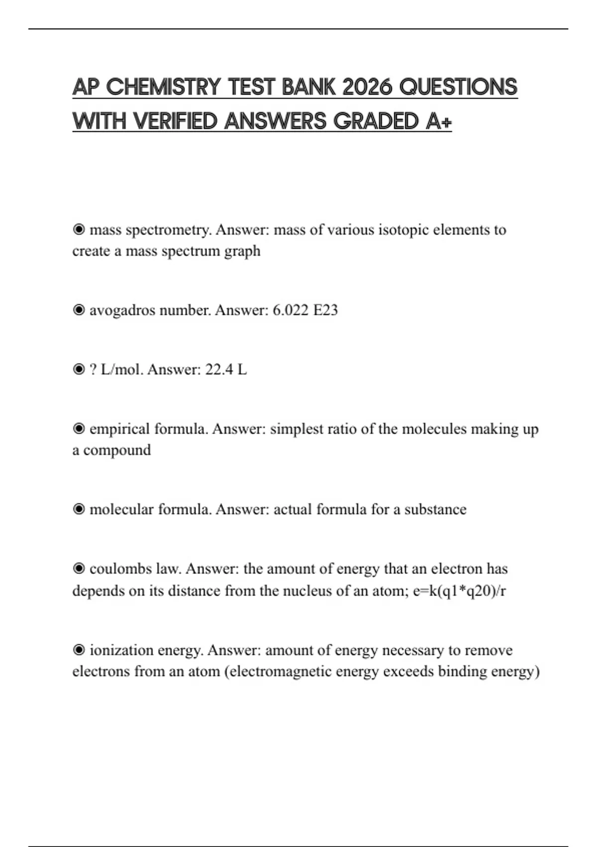 AP CHEMISTRY TEST BANK 2026 QUESTIONS WITH VERIFIED ANSWERS GRADED A+