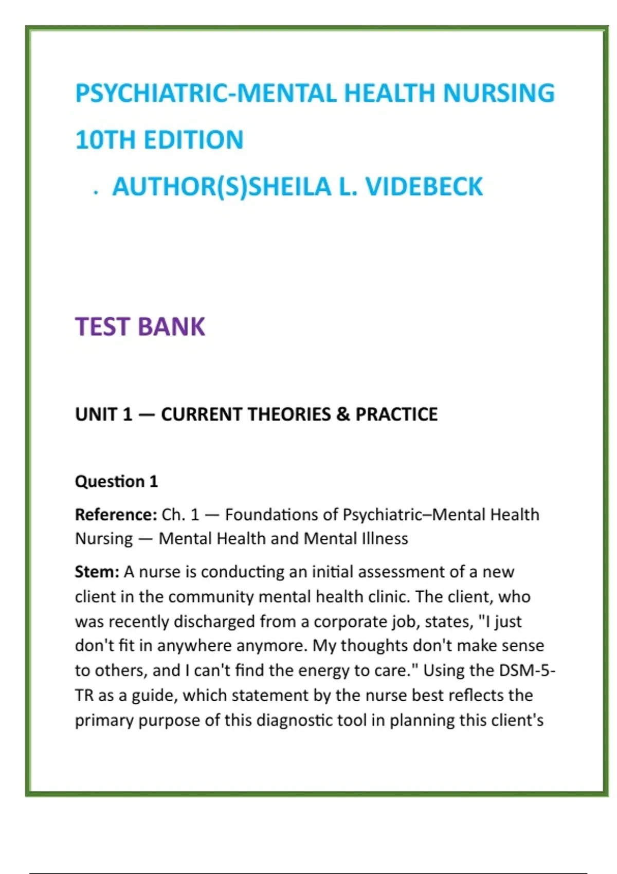 Psychiatric–Mental Health Nursing Test Bank | Videbeck 10th Ed | NCLEX-Style Psych Nursing MCQs & Therapeutic Communication 2️⃣ SEO Product Description (200–300 words) Master psychiatric–mental health nursing with confidence using this comprehensive digital Test Bank for Psychiatric–Mental Health Nursing, 10th Edition by Sheila L. Videbeck—a globally trusted authority in mental health nursing education. This exam-focused resource delivers FULL textbook coverage of all units and chapters, providing 20 rigorously written NCLEX-style multiple-choice questions per chapter, each paired with accurate answers and detailed, evidence-based rationales. Designed to reinforce core psychiatric nursing concepts, this test bank strengthens clinical judgment, therapeutic communication, patient safety, and ethical decision-making—the skills essential for success in both coursework and clinical practice. Every question reflects real-world psychiatric nursing scenarios, including mental health assessment, nurse–patient relationships, psychopharmacology, anxiety and mood disorders, psychotic and personality disorders, substance-related conditions, cognitive disorders, crisis intervention, and legal–ethical responsibilities. Content is aligned with NCLEX-RN® standards, making it ideal for exam preparation and clinical readiness. Whether you are preparing for psychiatric–mental health nursing exams, validating clinical competencies, or strengthening your confidence for NCLEX-RN® psychiatric content, this digital test bank is a time-saving, high-yield study solution trusted by nursing students worldwide. Perfect for courses such as: Psychiatric–Mental Health Nursing (PMHN) Behavioral Health Nursing Mental Health & Psychosocial Nursing NCLEX-RN® Psychiatric Nursing Preparation Clinical Mental Health Rotations & Skills Validation Key Features: FULL chapter-by-chapter coverage of Videbeck’s 10th Edition 20 NCLEX-style MCQs per chapter Detailed rationales for every answer Emphasis on therapeutic communication & clinical judgment 100% digital, exam-focused, and easy to use 3️⃣ 8 High-Value SEO Keywords psychiatric mental health nursing test bank Videbeck psychiatric nursing 10th edition mental health nursing study guide psych nursing MCQs therapeutic communication nursing questions NCLEX psychiatric nursing prep behavioral health nursing test bank psychiatric nursing exam questions 4️⃣ 10 Hashtags #PsychiatricMentalHealthNursing #PsychNursingTestBank #VidebeckNursing #MentalHealthNursing #NCLEXPsychPrep #TherapeuticCommunication #BehavioralHealthNursing #NursingSchoolSuccess #PsychNursingMCQs #NCLEXRNPrep